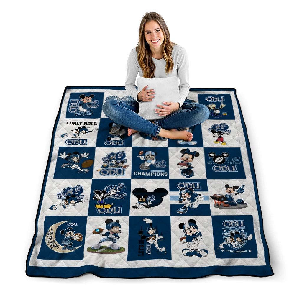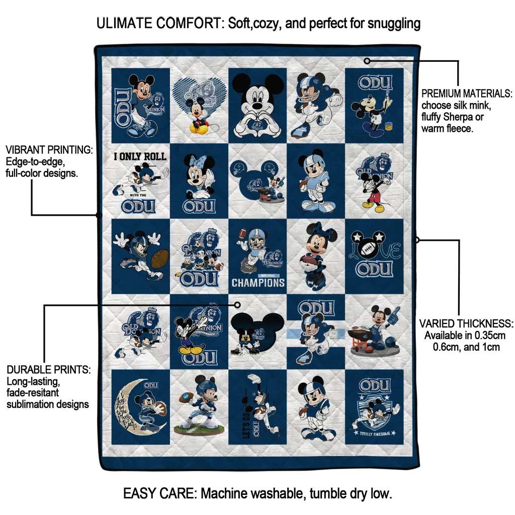 Wrap yourself in warmth and pride with the Old Dominion Monarchs Mickey Mouse Motif Blue White Quilt Blanket from the Old Dominion Monarchs Blankets collection at Yes That Blanket. Made from 100% premium quilting-weight polyester blended with a touch of microfiber, this quilt offers a smooth, soft finish you’ll love. Choose between two quilting styles—Stipple or Diagonal—and enjoy the comfort of a cotton-filled layer inside that adds extra coziness for every season. The border is available in classic black or white, giving your design a clean, timeless edge.