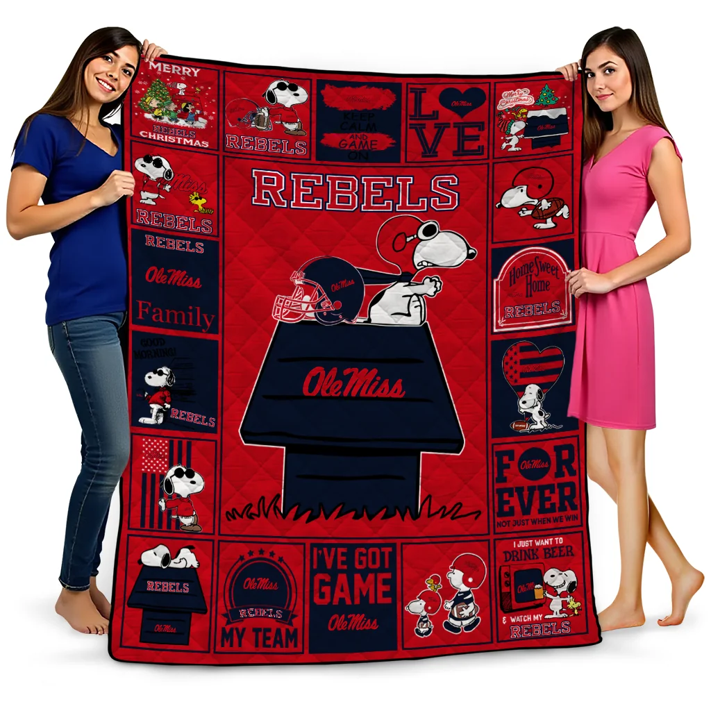 Wrap yourself in warmth and pride with the Ole Miss Rebels Snoopy Love Red Quilt Blanket from the Ole Miss Rebels Blankets collection at Yes That Blanket. Made from 100% premium quilting-weight polyester blended with a touch of microfiber, this quilt offers a smooth, soft finish you’ll love. Choose between two quilting styles—Stipple or Diagonal—and enjoy the comfort of a cotton-filled layer inside that adds extra coziness for every season. The border is available in classic black or white, giving your design a clean, timeless edge.