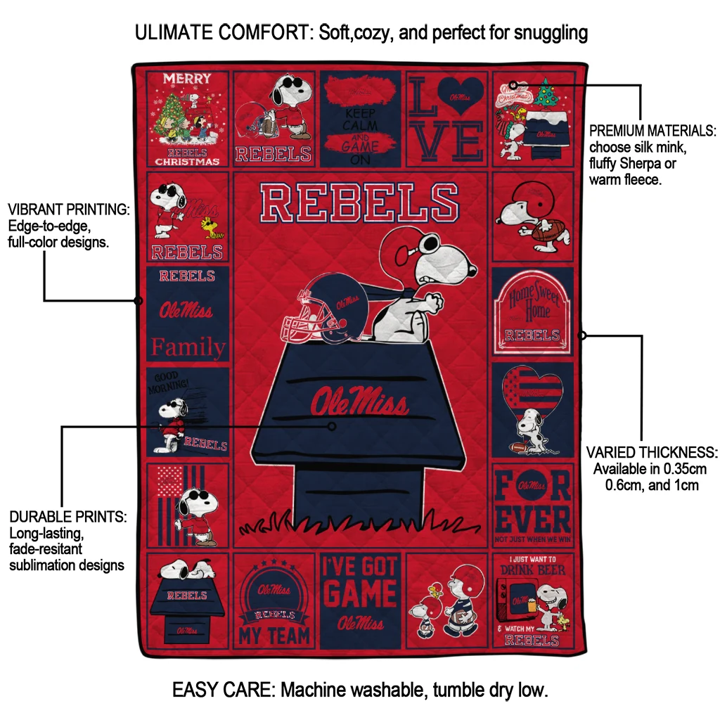The Ole Miss Rebels Snoopy Love Red Quilt Blanket is more than a blanket—it’s everyday comfort, thoughtfully made. Crafted from premium quilting fabric with a soft microfiber touch, it offers a smooth hand-feel and lasting coziness. Layered quilting with a cotton-filled core provides adaptable warmth across seasons while maintaining a clean, tailored look on your bed or sofa.