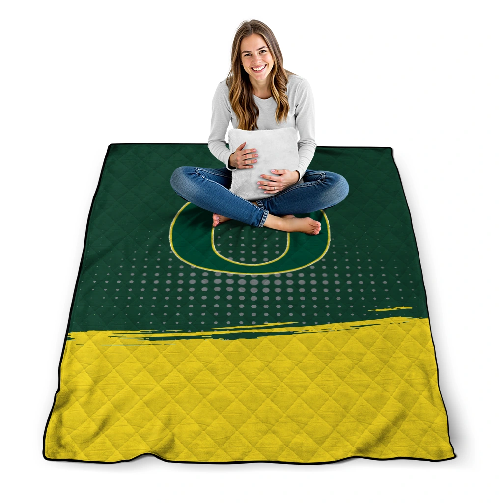 Wrap yourself in warmth and pride with the Oregon Ducks Dot Illusion Green Quilt Blanket from the Oregon Ducks Blankets collection at Yes That Blanket. Made from 100% premium quilting-weight polyester blended with a touch of microfiber, this quilt offers a smooth, soft finish you’ll love. Choose between two quilting styles—Stipple or Diagonal—and enjoy the comfort of a cotton-filled layer inside that adds extra coziness for every season. The border is available in classic black or white, giving your design a clean, timeless edge.