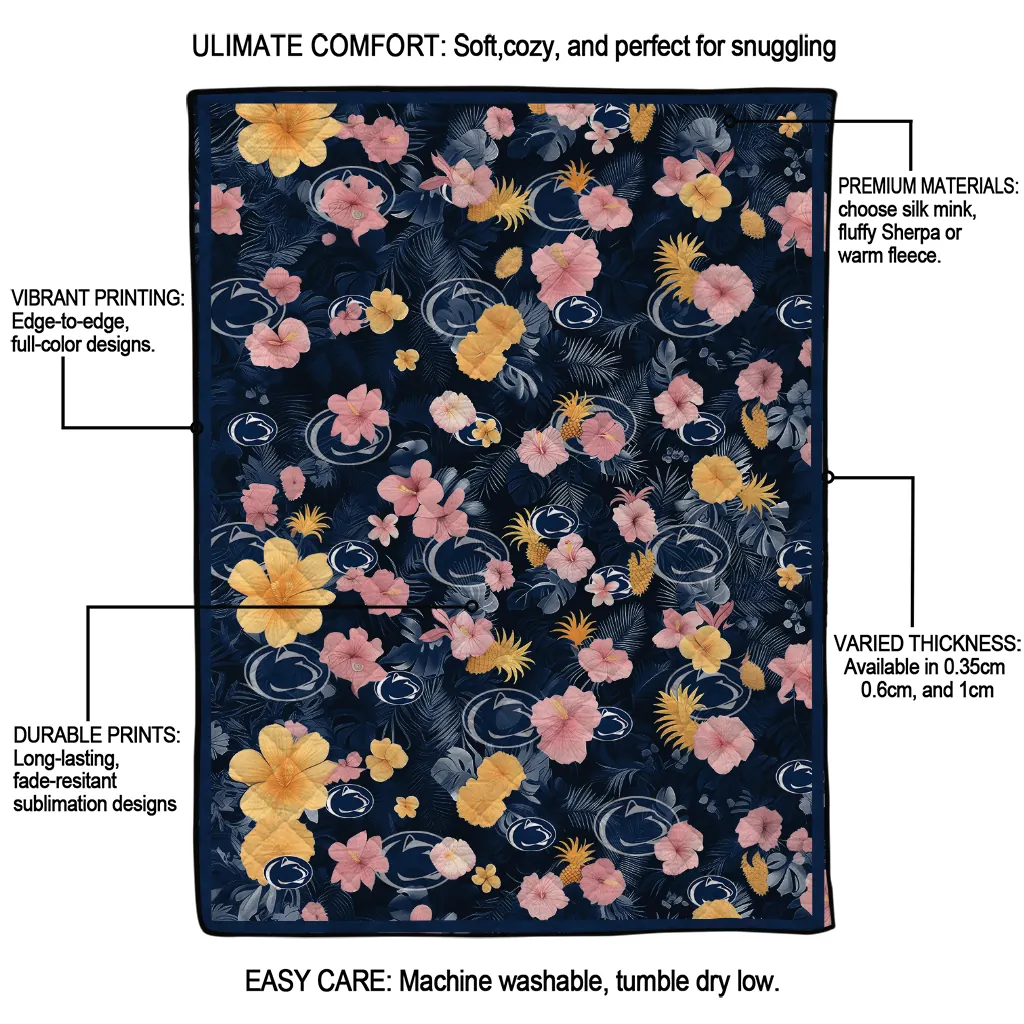Wrap yourself in warmth and pride with the Penn State Nittany Lions Hibiscus Foliage Blue Quilt Blanket from the Penn State Nittany Lions Blankets collection at Yes That Blanket. Made from 100% premium quilting-weight polyester blended with a touch of microfiber, this quilt offers a smooth, soft finish you’ll love. Choose between two quilting styles—Stipple or Diagonal—and enjoy the comfort of a cotton-filled layer inside that adds extra coziness for every season. The border is available in classic black or white, giving your design a clean, timeless edge.
