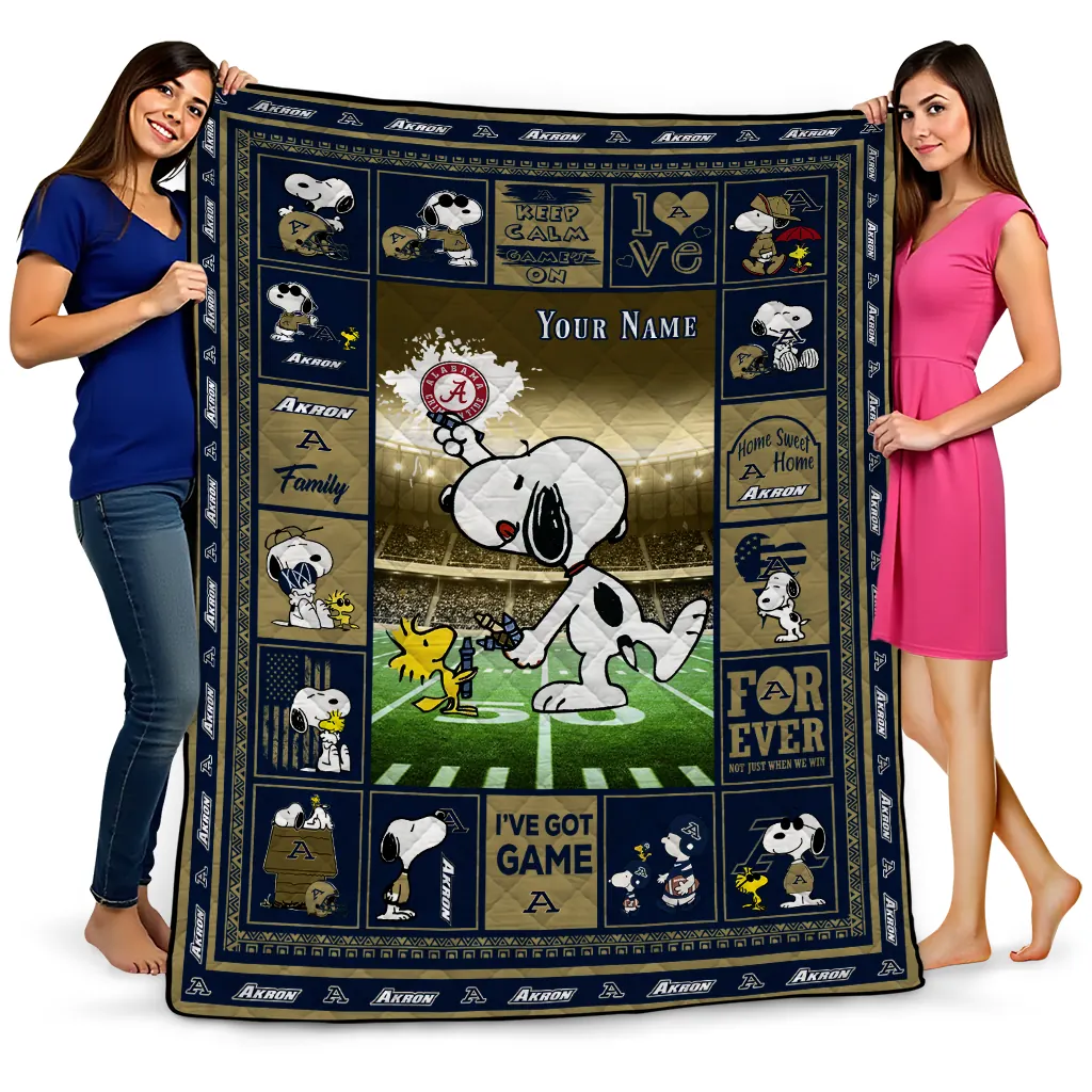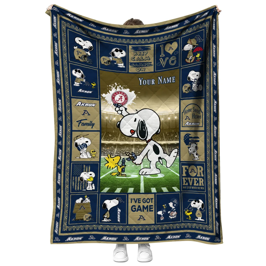 Wrap yourself in warmth and pride with the Personalized Akron Zips Snoopy Coach Blue Quilt Blanket from the Akron Zips Blankets collection at Yes That Blanket. Made from 100% premium quilting-weight polyester blended with a touch of microfiber, this quilt offers a smooth, soft finish you’ll love. Choose between two quilting styles—Stipple or Diagonal—and enjoy the comfort of a cotton-filled layer inside that adds extra coziness for every season. The border is available in classic black or white, giving your design a clean, timeless edge.