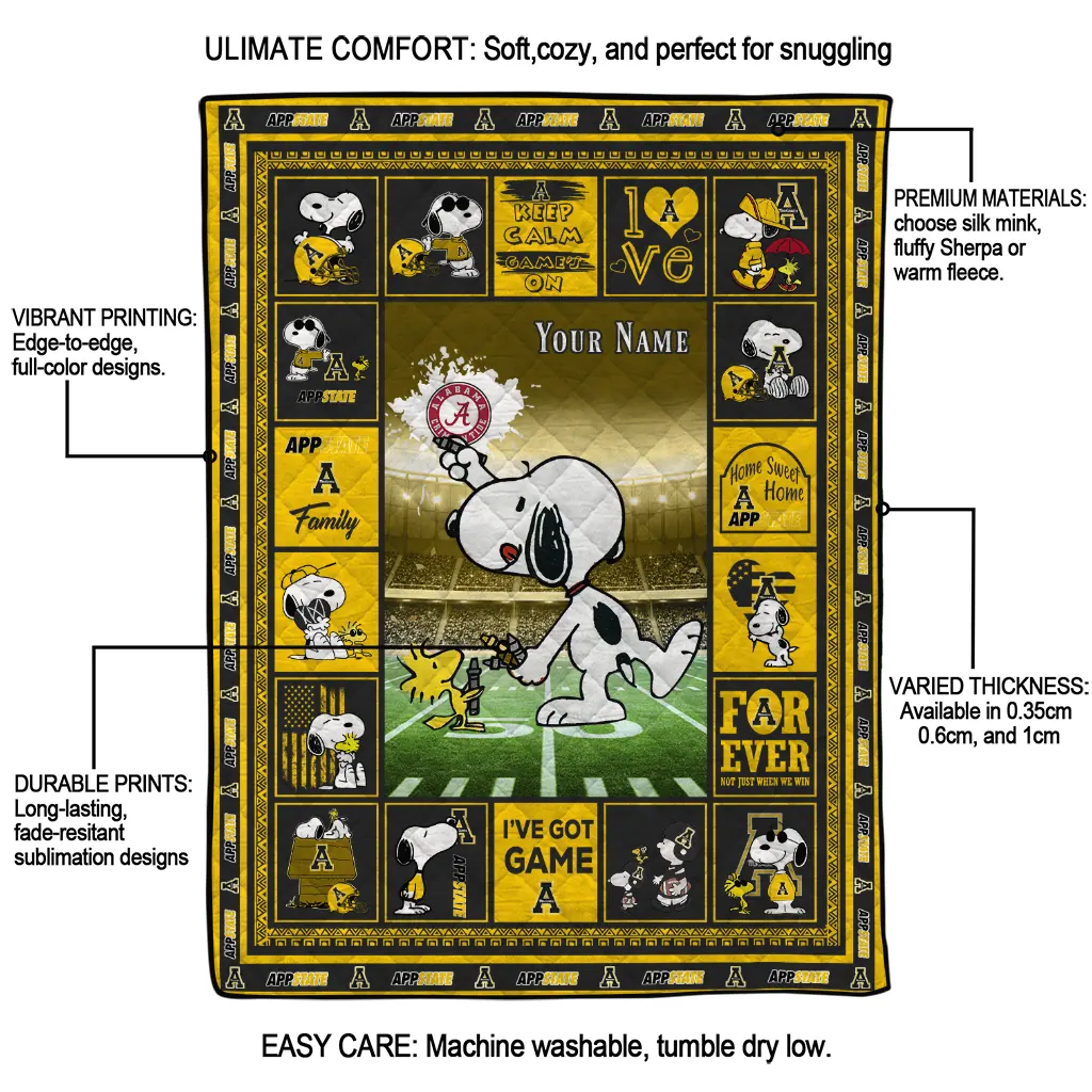 Wrap yourself in warmth and pride with the Personalized Appalachian State Mountaineers Snoopy Coach Black Quilt Blanket from the Appalachian State Mountaineers Blankets collection at Yes That Blanket. Made from 100% premium quilting-weight polyester blended with a touch of microfiber, this quilt offers a smooth, soft finish you’ll love. Choose between two quilting styles—Stipple or Diagonal—and enjoy the comfort of a cotton-filled layer inside that adds extra coziness for every season. The border is available in classic black or white, giving your design a clean, timeless edge.