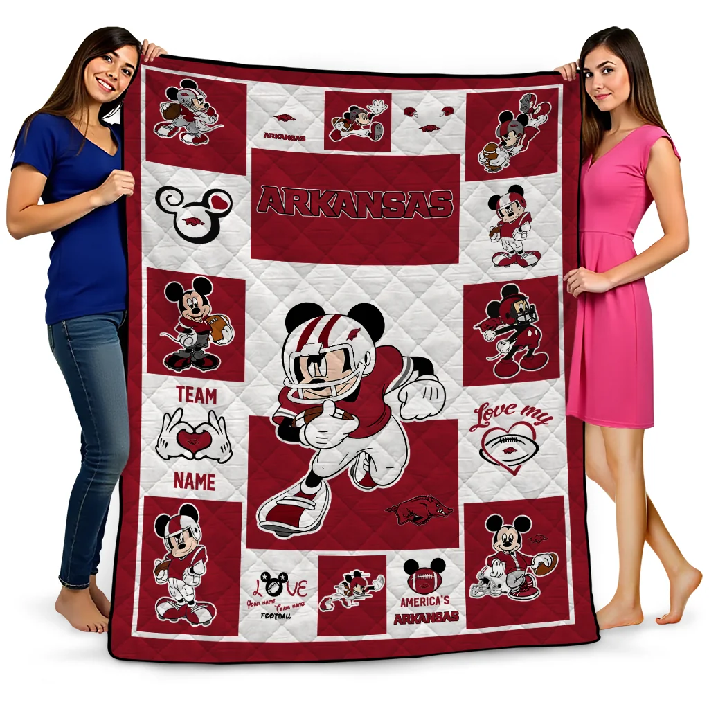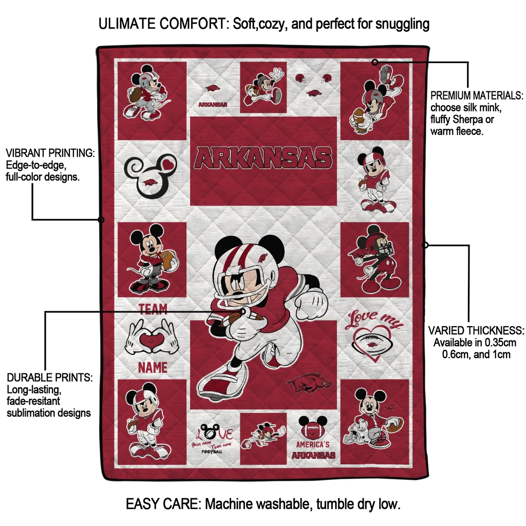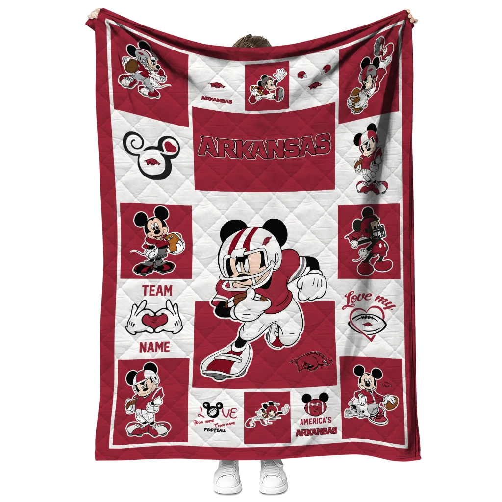 Wrap yourself in warmth and pride with the Personalized Arkansas Razorbacks Mickey Crimson Red White Quilt Blanket from the Arkansas Razorbacks Blankets collection at Yes That Blanket. Made from 100% premium quilting-weight polyester blended with a touch of microfiber, this quilt offers a smooth, soft finish you’ll love. Choose between two quilting styles—Stipple or Diagonal—and enjoy the comfort of a cotton-filled layer inside that adds extra coziness for every season. The border is available in classic black or white, giving your design a clean, timeless edge.