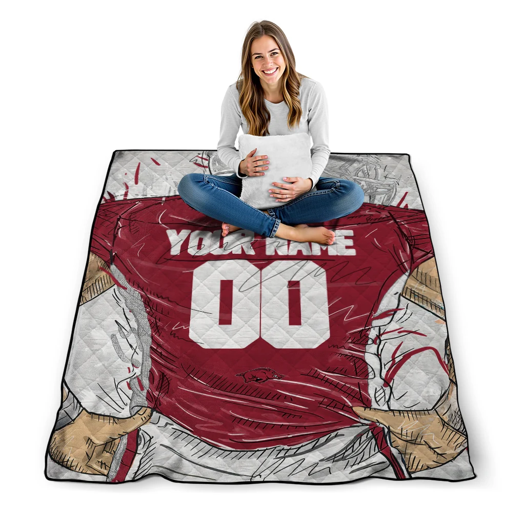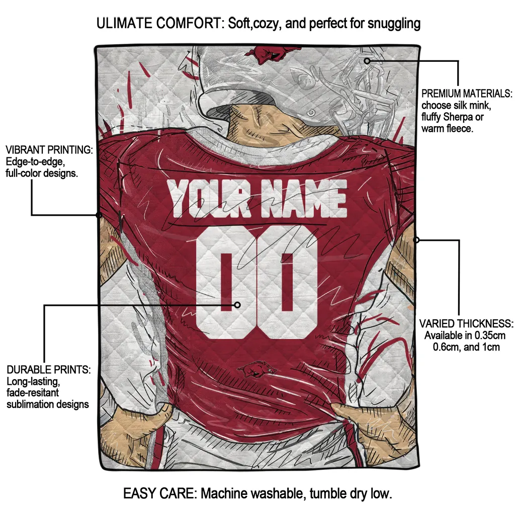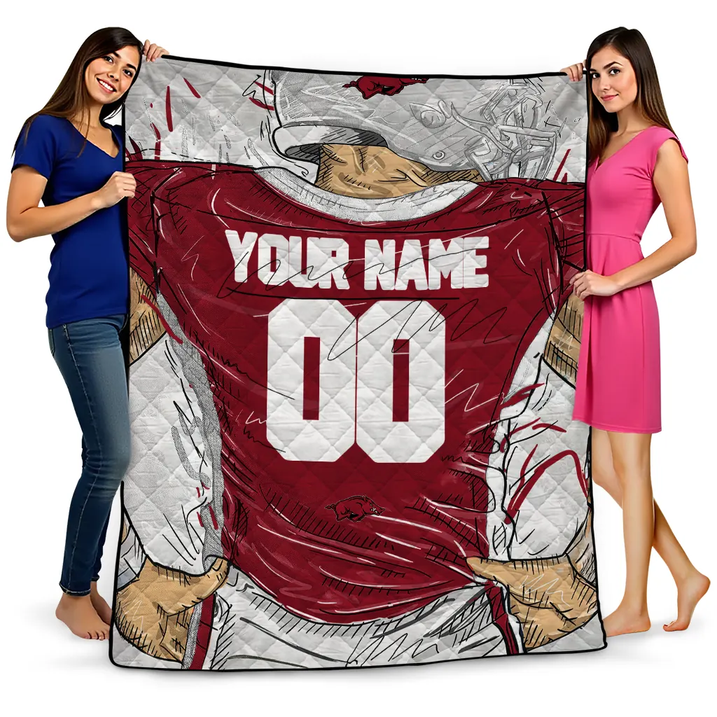 Personalized Arkansas Razorbacks Player Sketch Red Gray Quilt Blanket