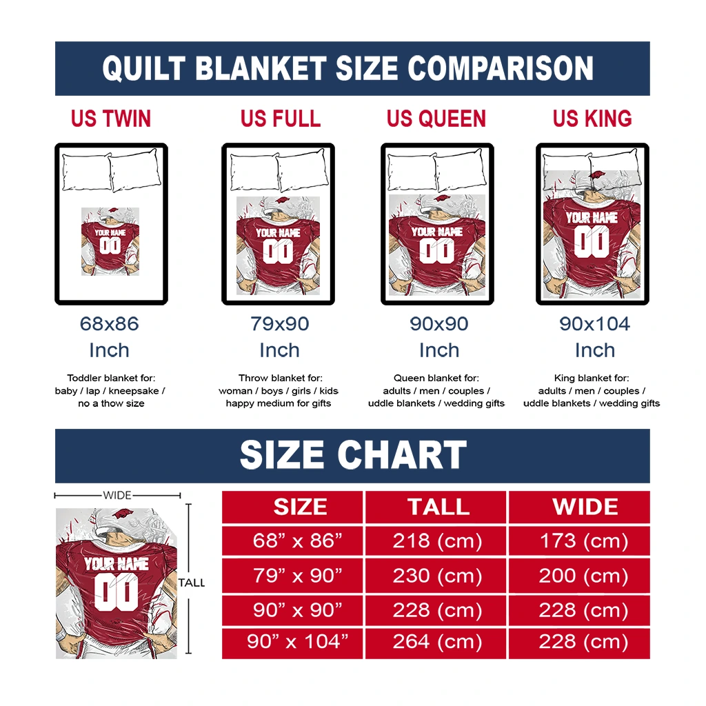 The Personalized Arkansas Razorbacks Player Sketch Red Gray Quilt Blanket is more than a blanket—it’s everyday comfort, thoughtfully made. Crafted from premium quilting fabric with a soft microfiber touch, it offers a smooth hand-feel and lasting coziness. Layered quilting with a cotton-filled core provides adaptable warmth across seasons while maintaining a clean, tailored look on your bed or sofa.