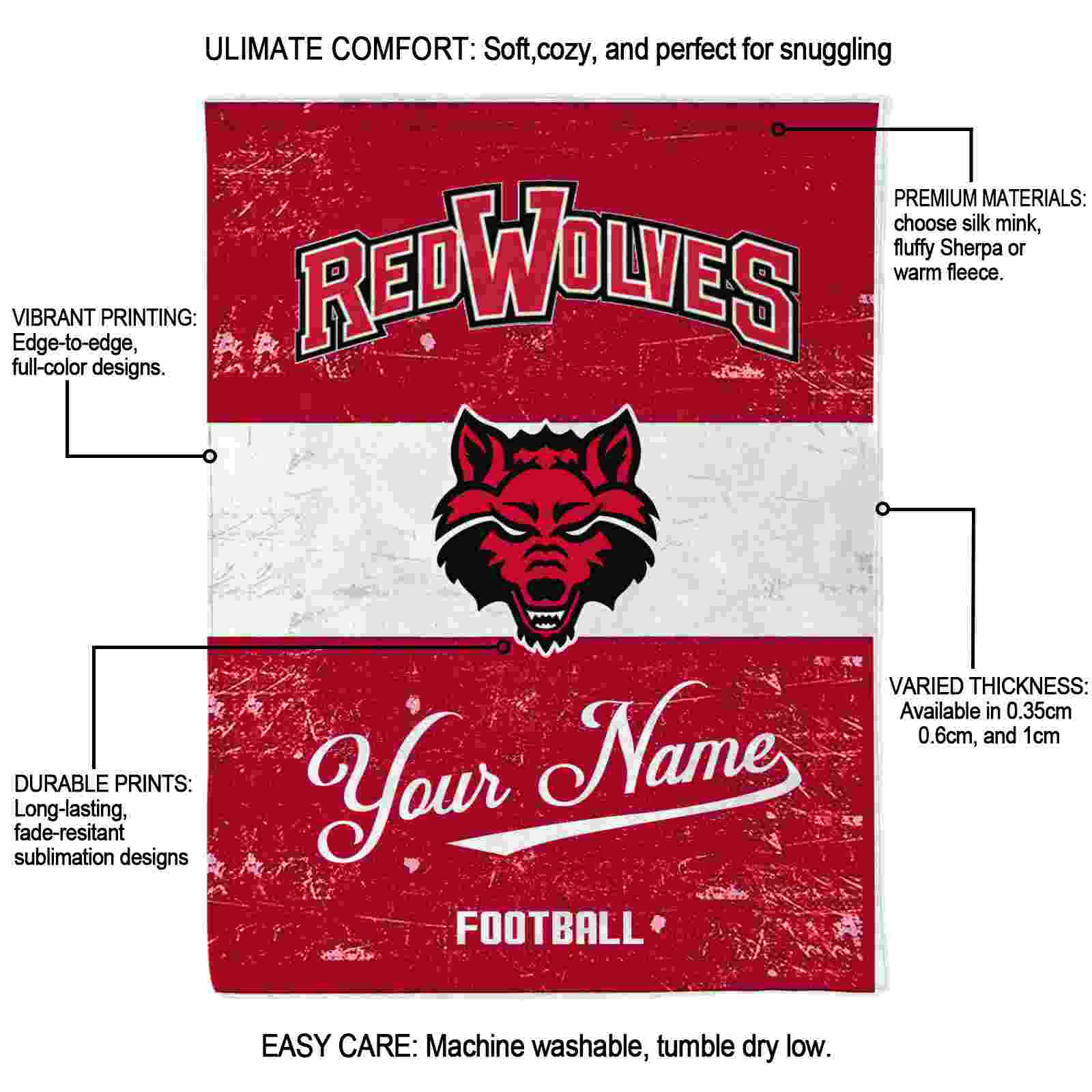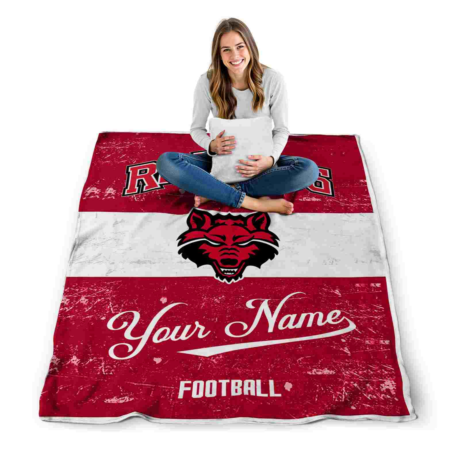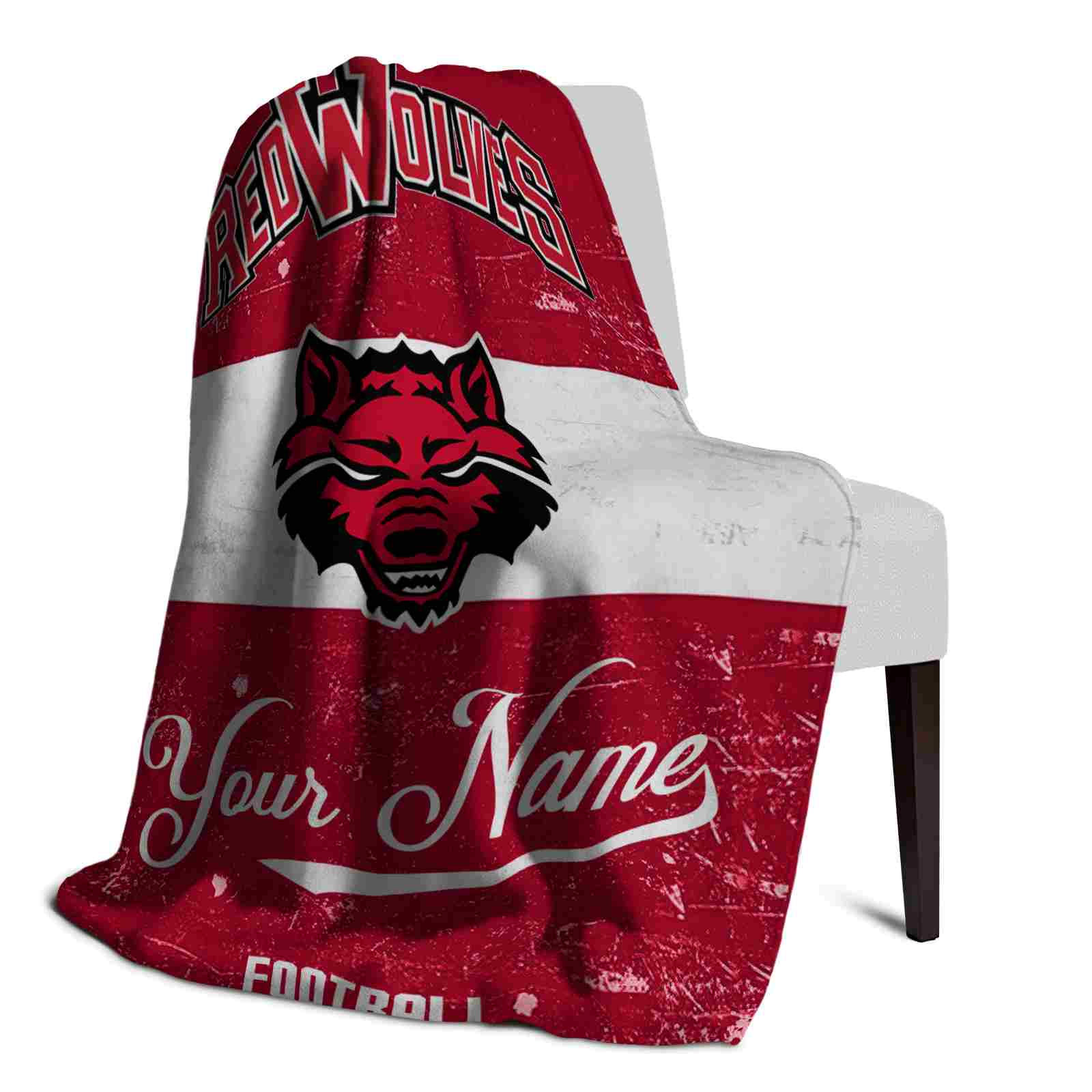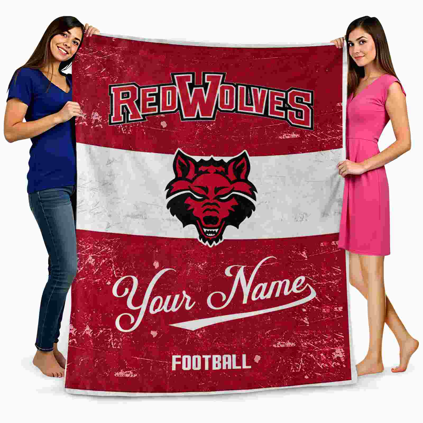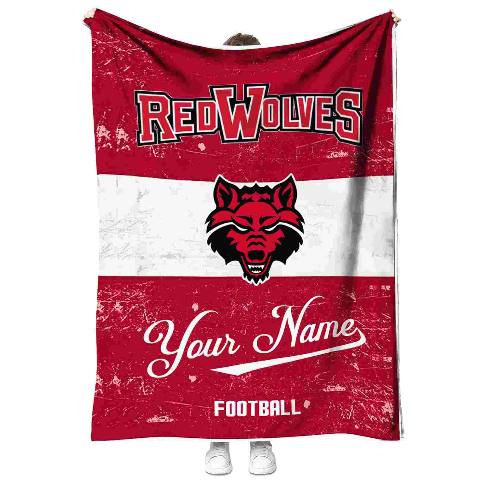 Without a doubt, the Personalized Arkansas State Red Wolves Grunge Texture Scarlet White Blanket from Arkansas State Red Wolves Blankets collection is offering true fans a chance to showcase passion in a cool way. Personalize it with your favorite team's logo or a meaningful name to make it uniquely yours. Isn't that great? The full-color print ensures vibrant, edge-to-edge designs, bringing your sports enthusiasm to life!