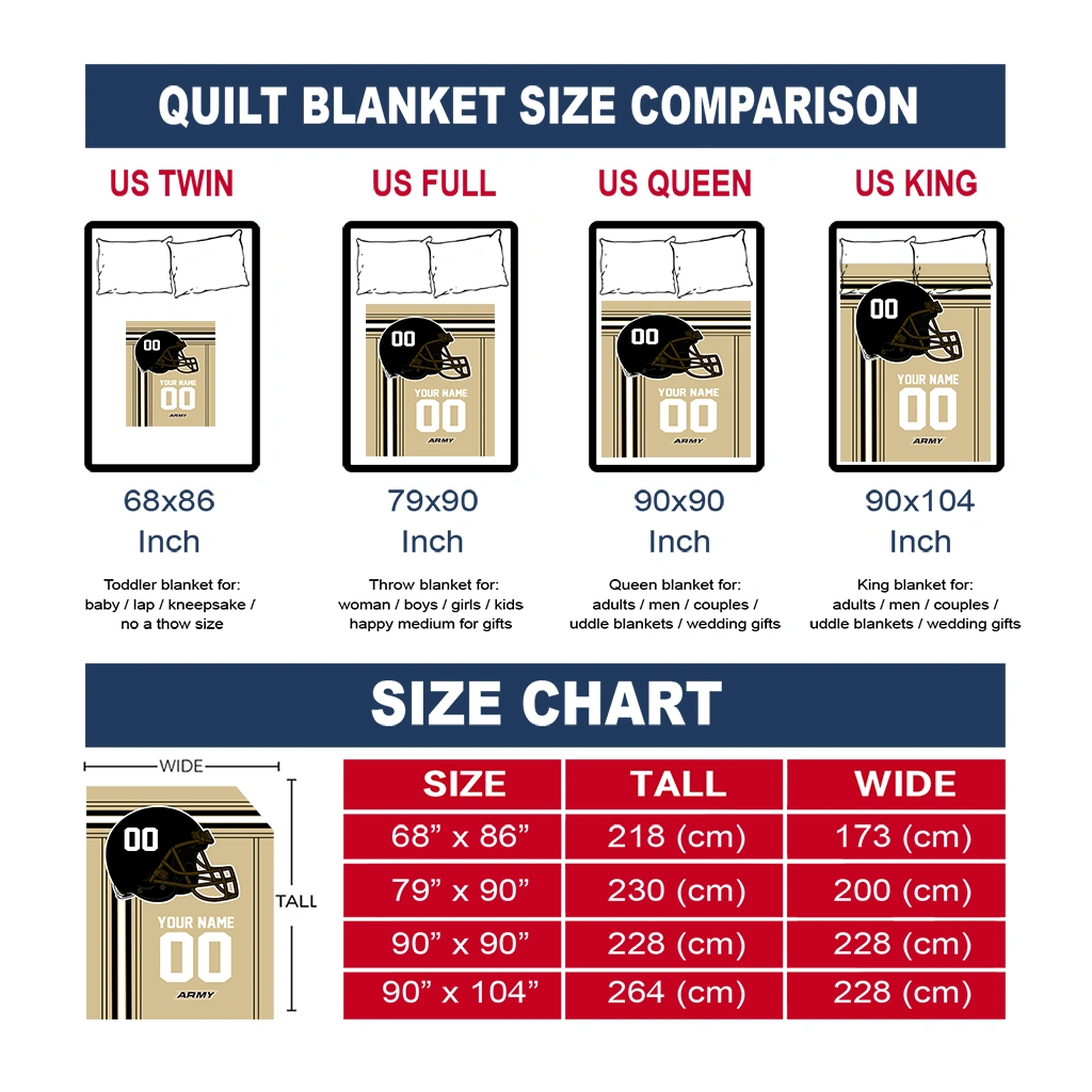 Wrap yourself in warmth and pride with the Personalized Army Black Knights Helmet Theme Gold Quilt Blanket from the Army Black Knights Blankets collection at Yes That Blanket. Made from 100% premium quilting-weight polyester blended with a touch of microfiber, this quilt offers a smooth, soft finish you’ll love. Choose between two quilting styles—Stipple or Diagonal—and enjoy the comfort of a cotton-filled layer inside that adds extra coziness for every season. The border is available in classic black or white, giving your design a clean, timeless edge.