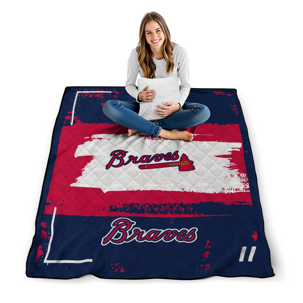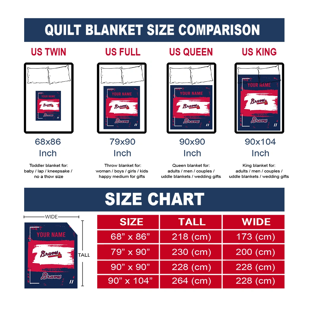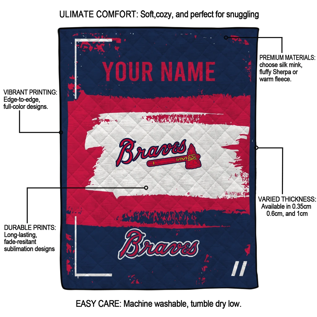 Wrap yourself in warmth and pride with the Personalized Atlanta Braves Grunge Patch Navy White Quilt Blanket from the Atlanta Braves Blankets collection at Yes That Blanket. Made from 100% premium quilting-weight polyester blended with a touch of microfiber, this quilt offers a smooth, soft finish you’ll love. Choose between two quilting styles—Stipple or Diagonal—and enjoy the comfort of a cotton-filled layer inside that adds extra coziness for every season. The border is available in classic black or white, giving your design a clean, timeless edge.