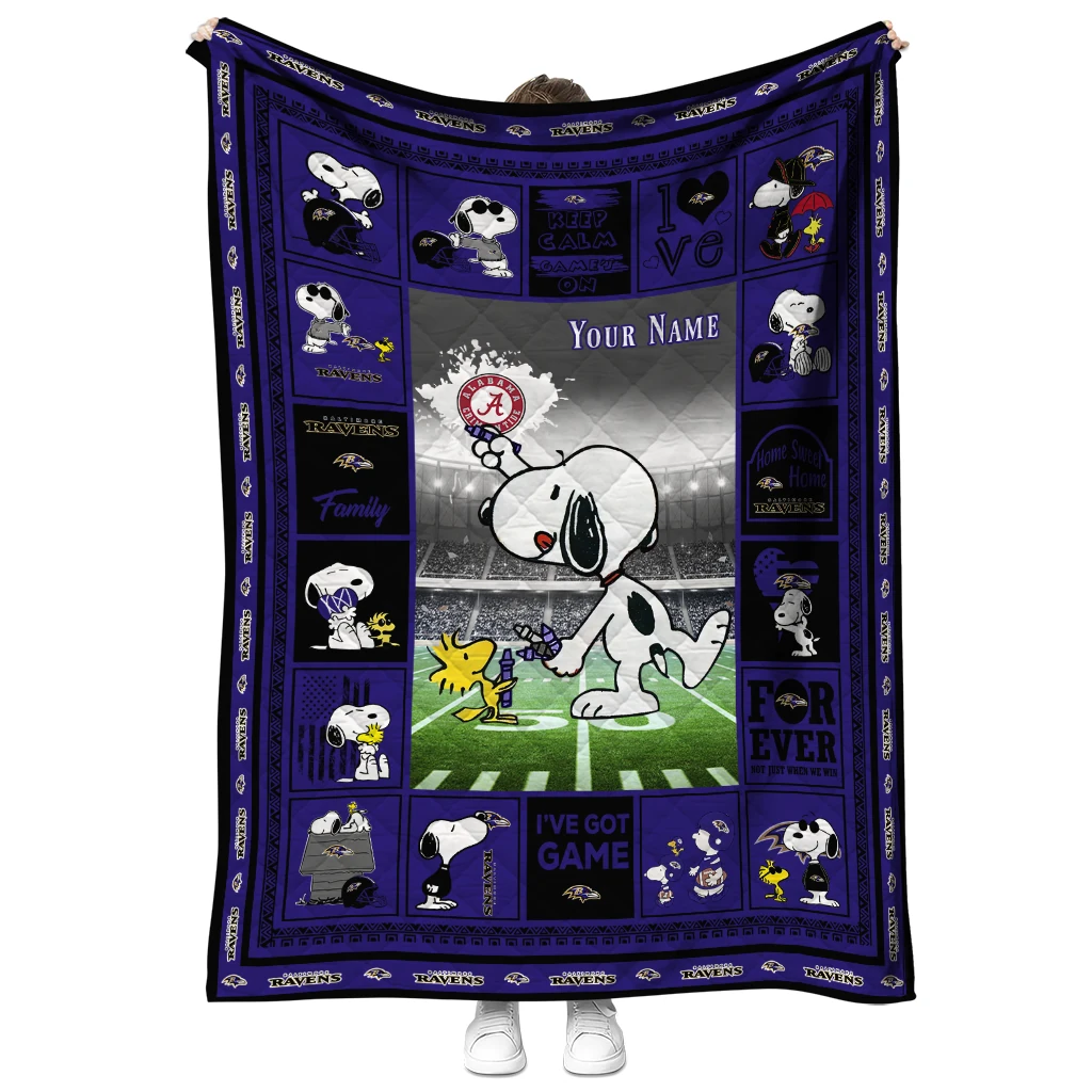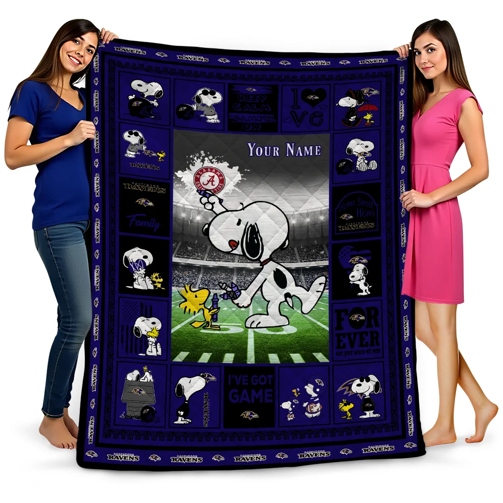 Wrap yourself in warmth and pride with the Personalized Baltimore Ravens Snoopy Coach Purple Quilt Blanket from the Baltimore Ravens Blankets collection at Yes That Blanket. Made from 100% premium quilting-weight polyester blended with a touch of microfiber, this quilt offers a smooth, soft finish you’ll love. Choose between two quilting styles—Stipple or Diagonal—and enjoy the comfort of a cotton-filled layer inside that adds extra coziness for every season. The border is available in classic black or white, giving your design a clean, timeless edge.