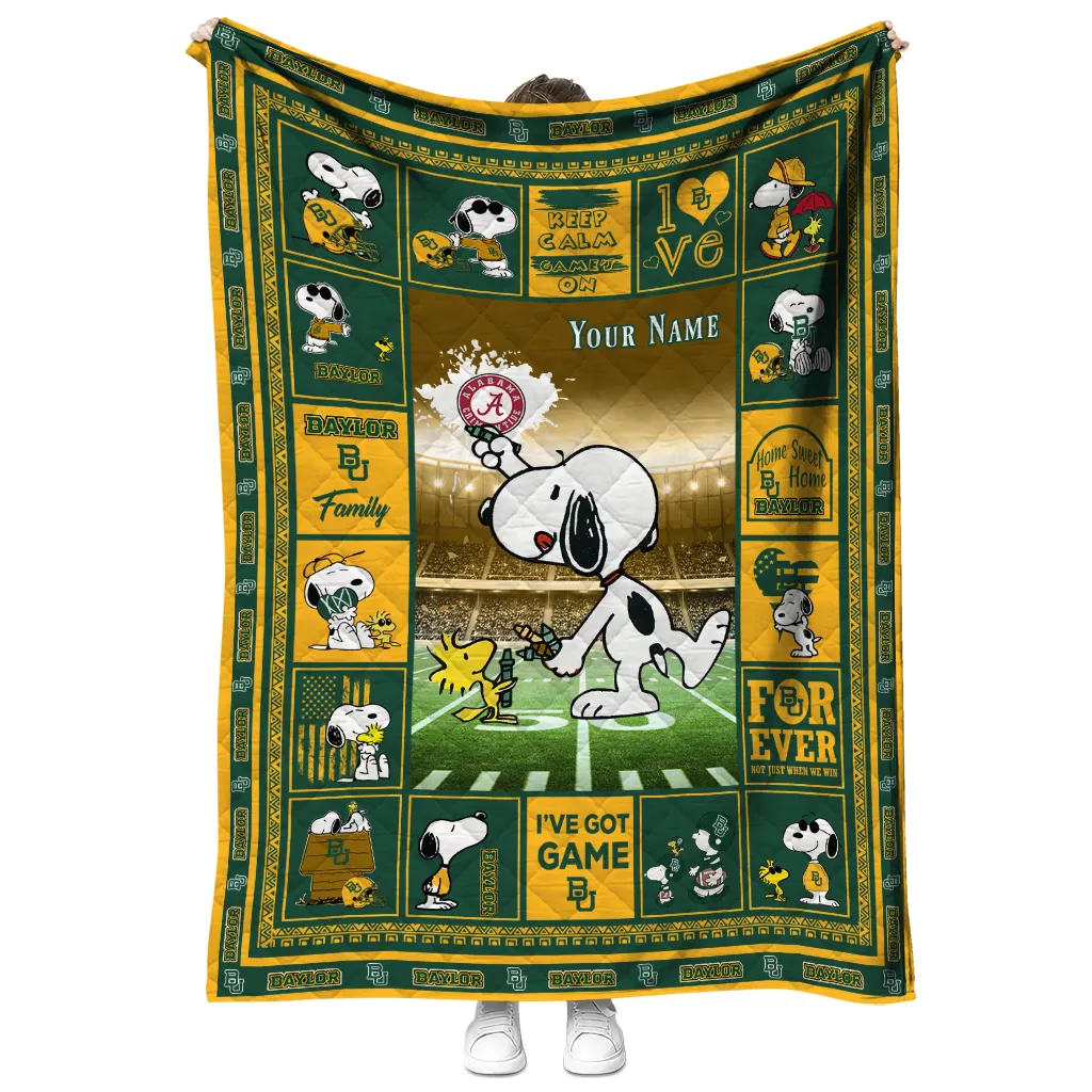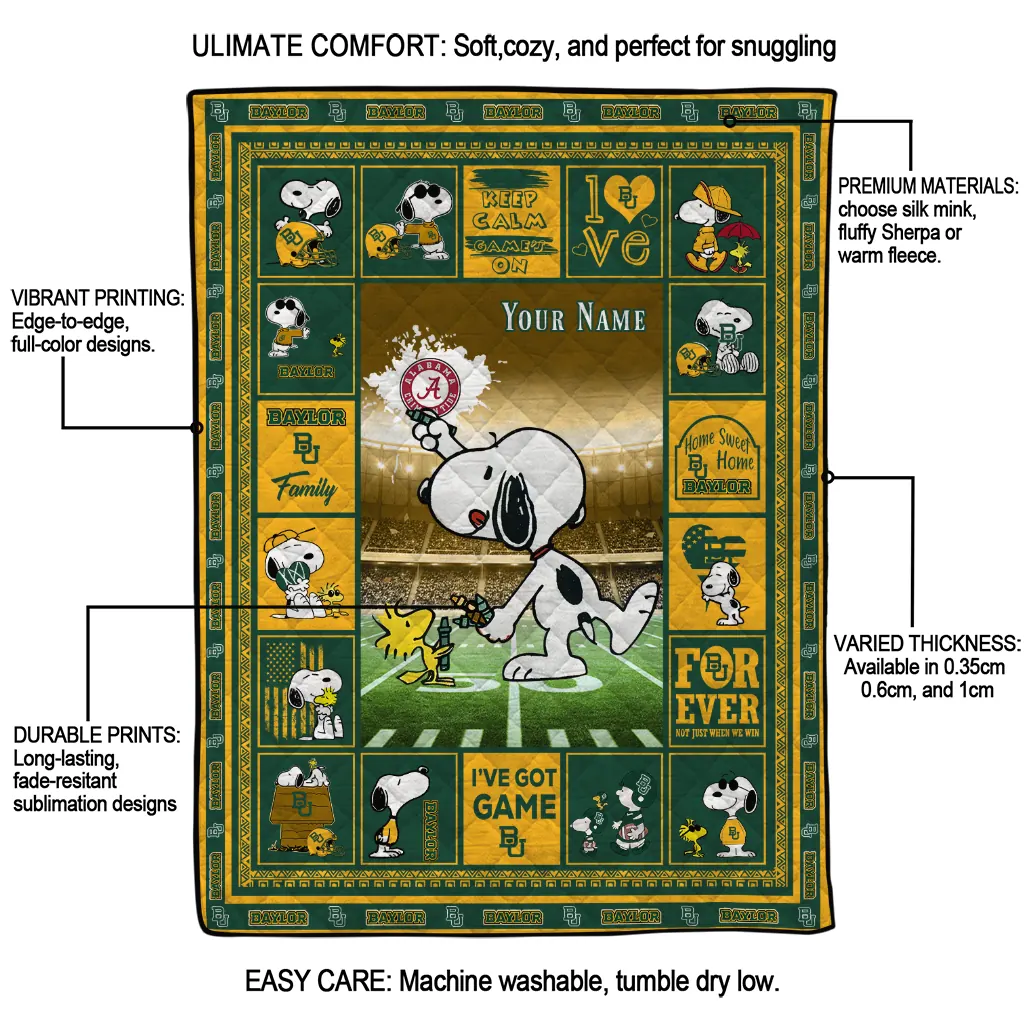 Wrap yourself in warmth and pride with the Personalized Baylor Bears Snoopy Coach Green Quilt Blanket from the Baylor Bears Blankets collection at Yes That Blanket. Made from 100% premium quilting-weight polyester blended with a touch of microfiber, this quilt offers a smooth, soft finish you’ll love. Choose between two quilting styles—Stipple or Diagonal—and enjoy the comfort of a cotton-filled layer inside that adds extra coziness for every season. The border is available in classic black or white, giving your design a clean, timeless edge.