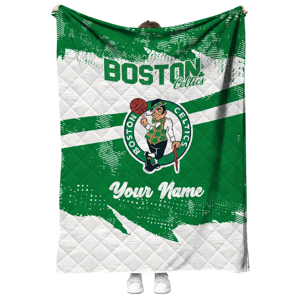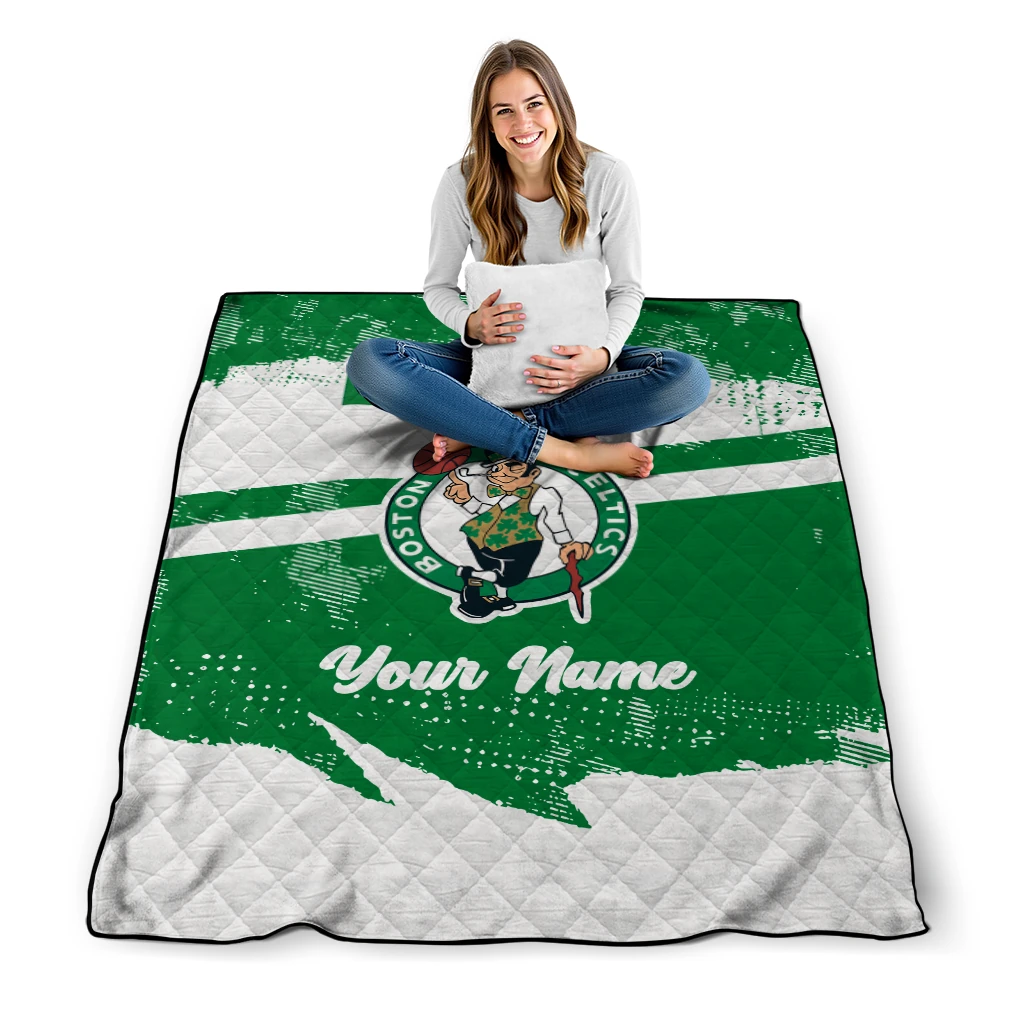 Wrap yourself in warmth and pride with the Personalized Boston Celtics Brushstroke Layers Green Quilt Blanket from the Boston Celtics Blankets collection at Yes That Blanket. Made from 100% premium quilting-weight polyester blended with a touch of microfiber, this quilt offers a smooth, soft finish you’ll love. Choose between two quilting styles—Stipple or Diagonal—and enjoy the comfort of a cotton-filled layer inside that adds extra coziness for every season. The border is available in classic black or white, giving your design a clean, timeless edge.