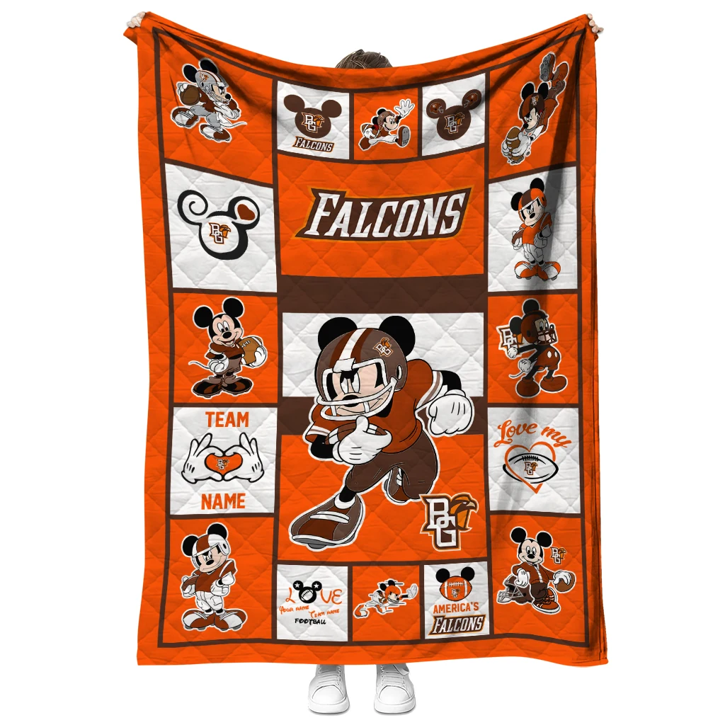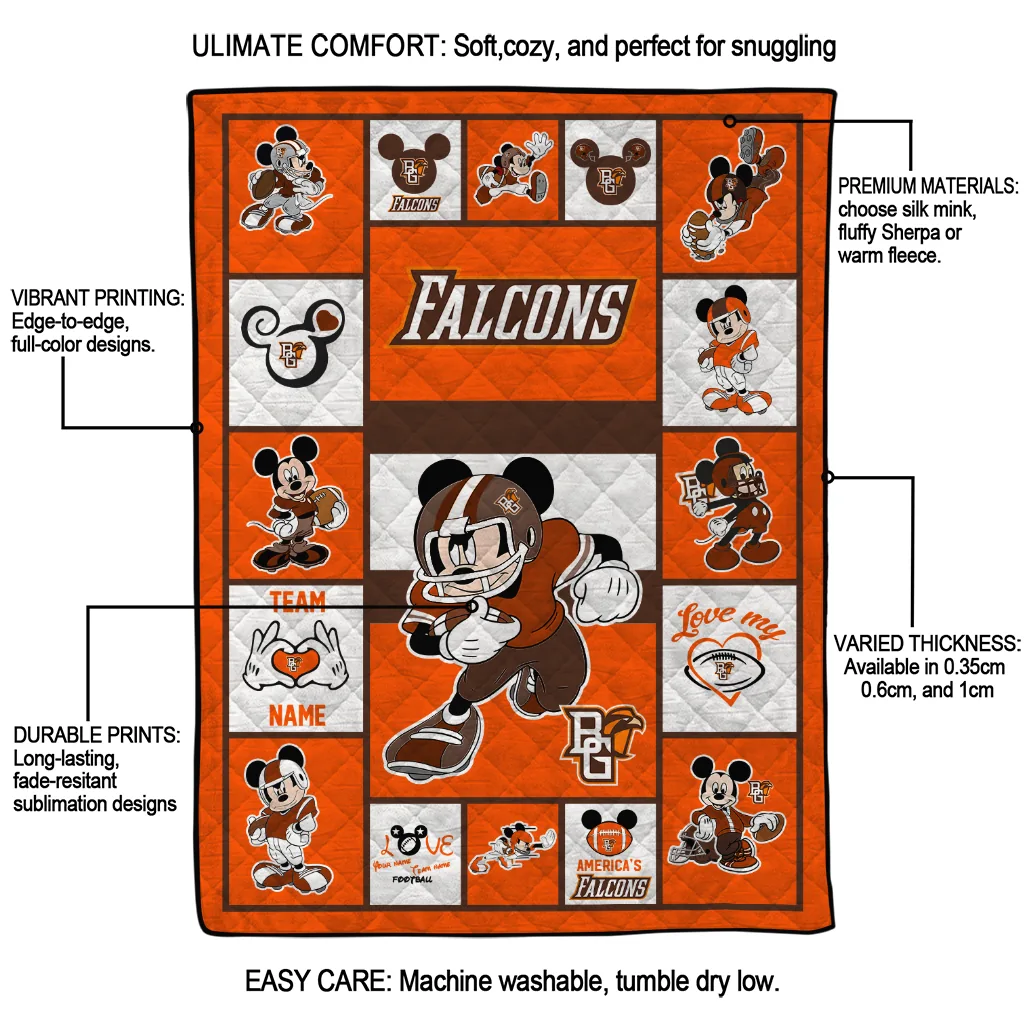 The Personalized Bowling Green Falcons Mickey Crimson Orange White Quilt Blanket is more than a blanket—it’s everyday comfort, thoughtfully made. Crafted from premium quilting fabric with a soft microfiber touch, it offers a smooth hand-feel and lasting coziness. Layered quilting with a cotton-filled core provides adaptable warmth across seasons while maintaining a clean, tailored look on your bed or sofa.