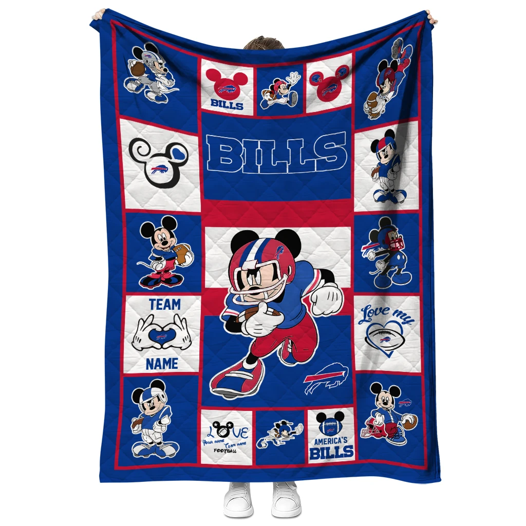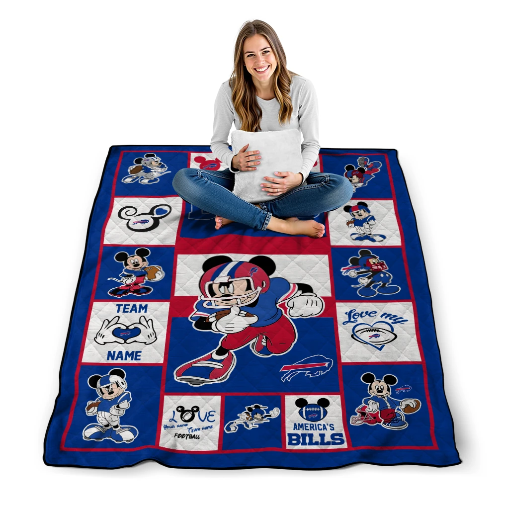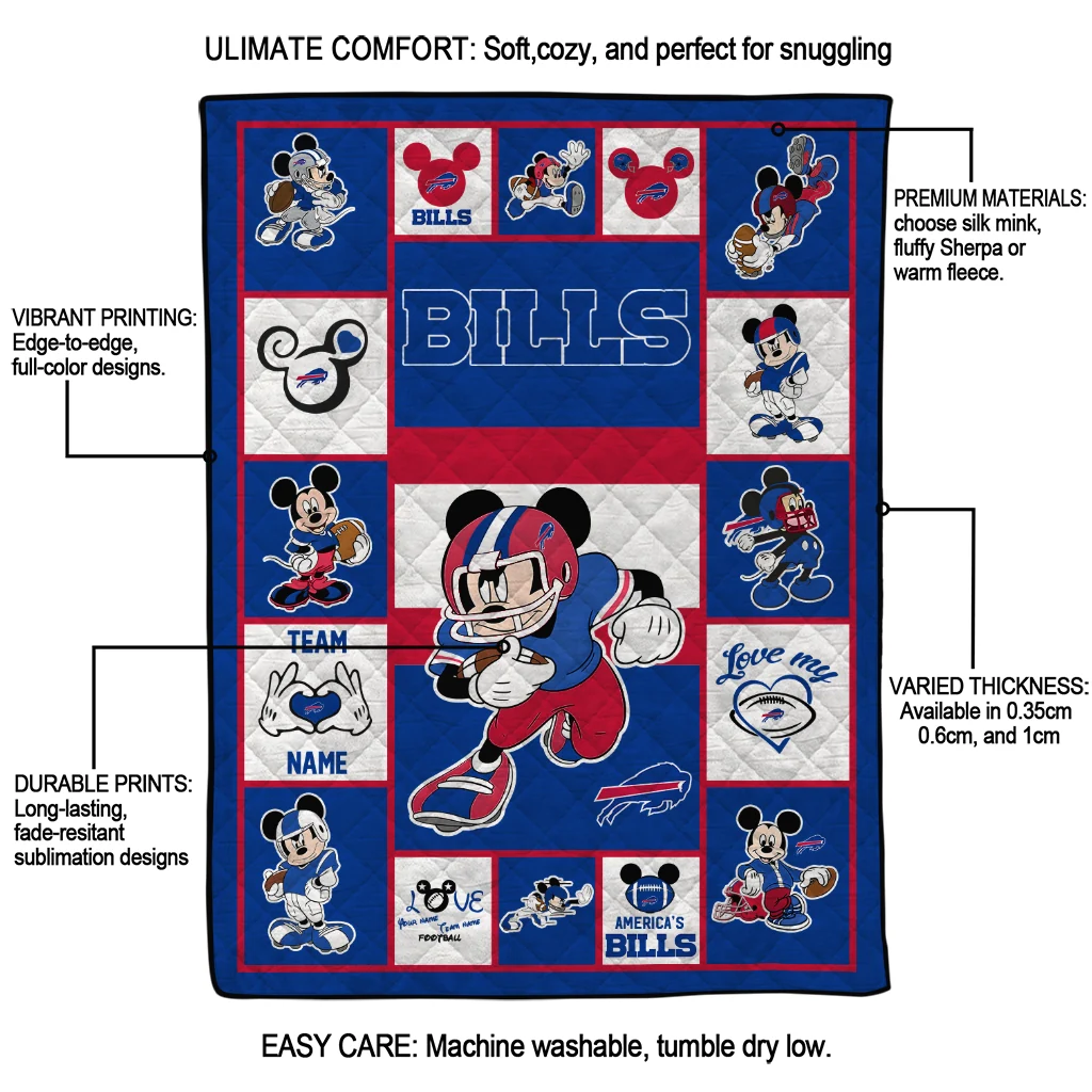 Wrap yourself in warmth and pride with the Personalized Buffalo Bills Mickey Crimson Blue White Quilt Blanket from the Buffalo Bills Blankets collection at Yes That Blanket. Made from 100% premium quilting-weight polyester blended with a touch of microfiber, this quilt offers a smooth, soft finish you’ll love. Choose between two quilting styles—Stipple or Diagonal—and enjoy the comfort of a cotton-filled layer inside that adds extra coziness for every season. The border is available in classic black or white, giving your design a clean, timeless edge.
