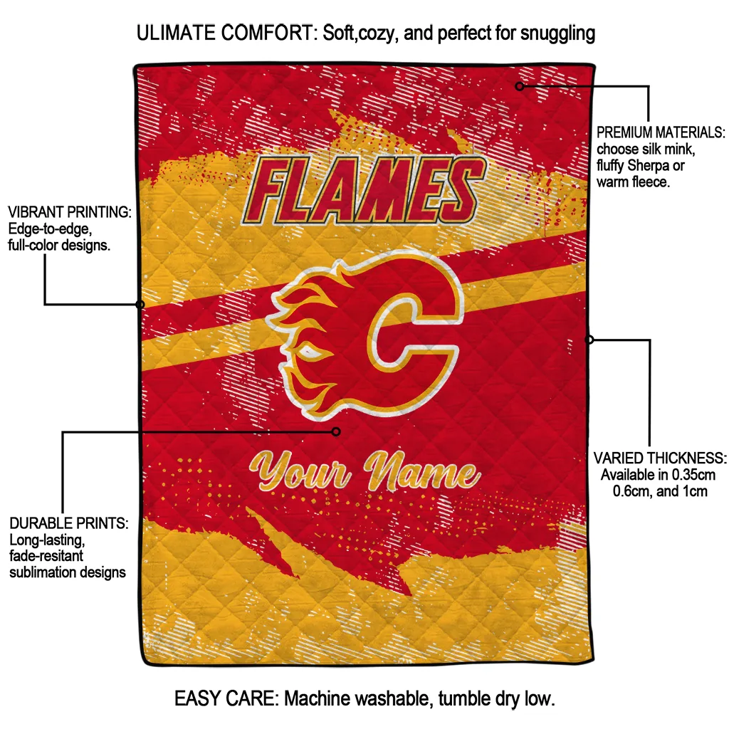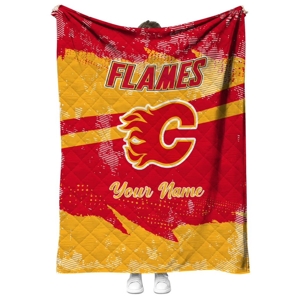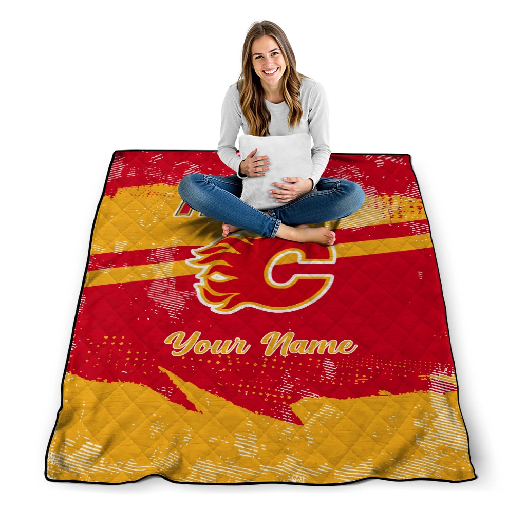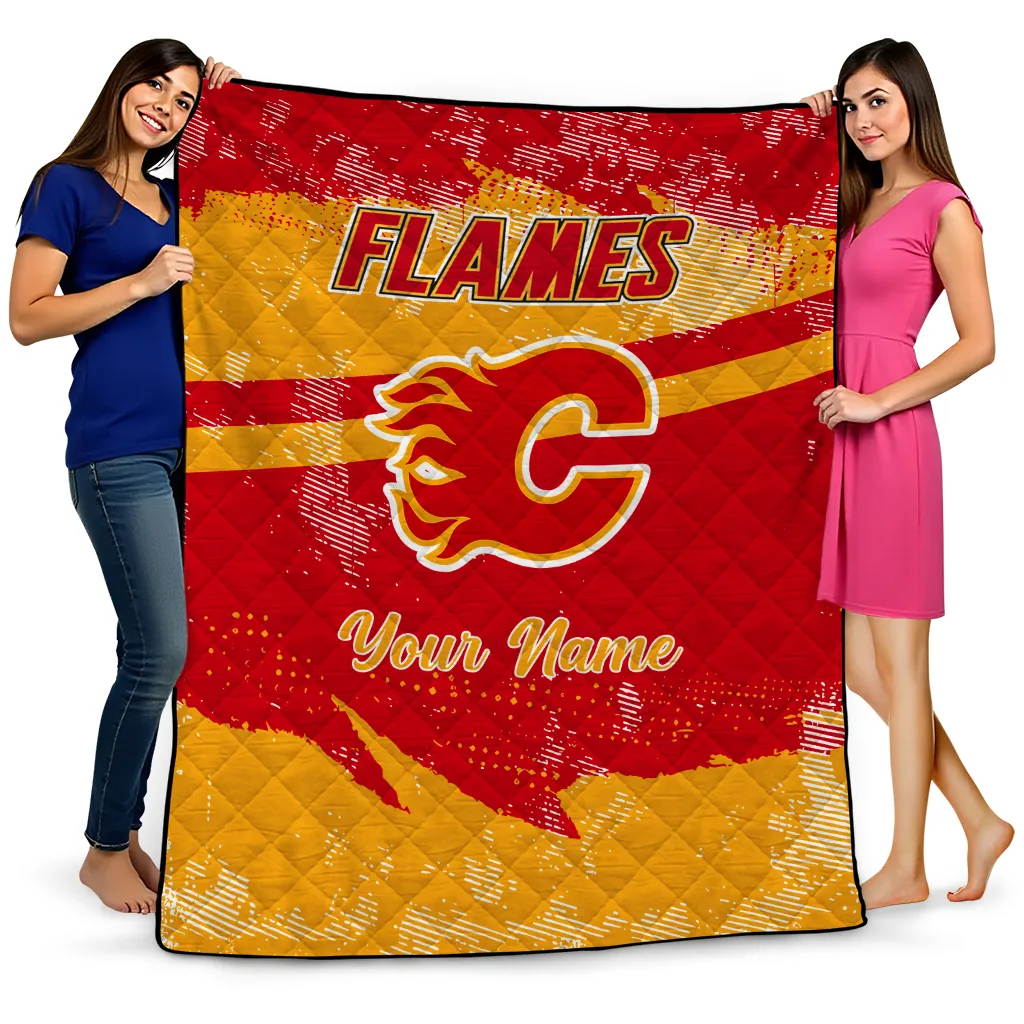 Personalized Calgary Flames Brushstroke Layers Red Quilt Blanket