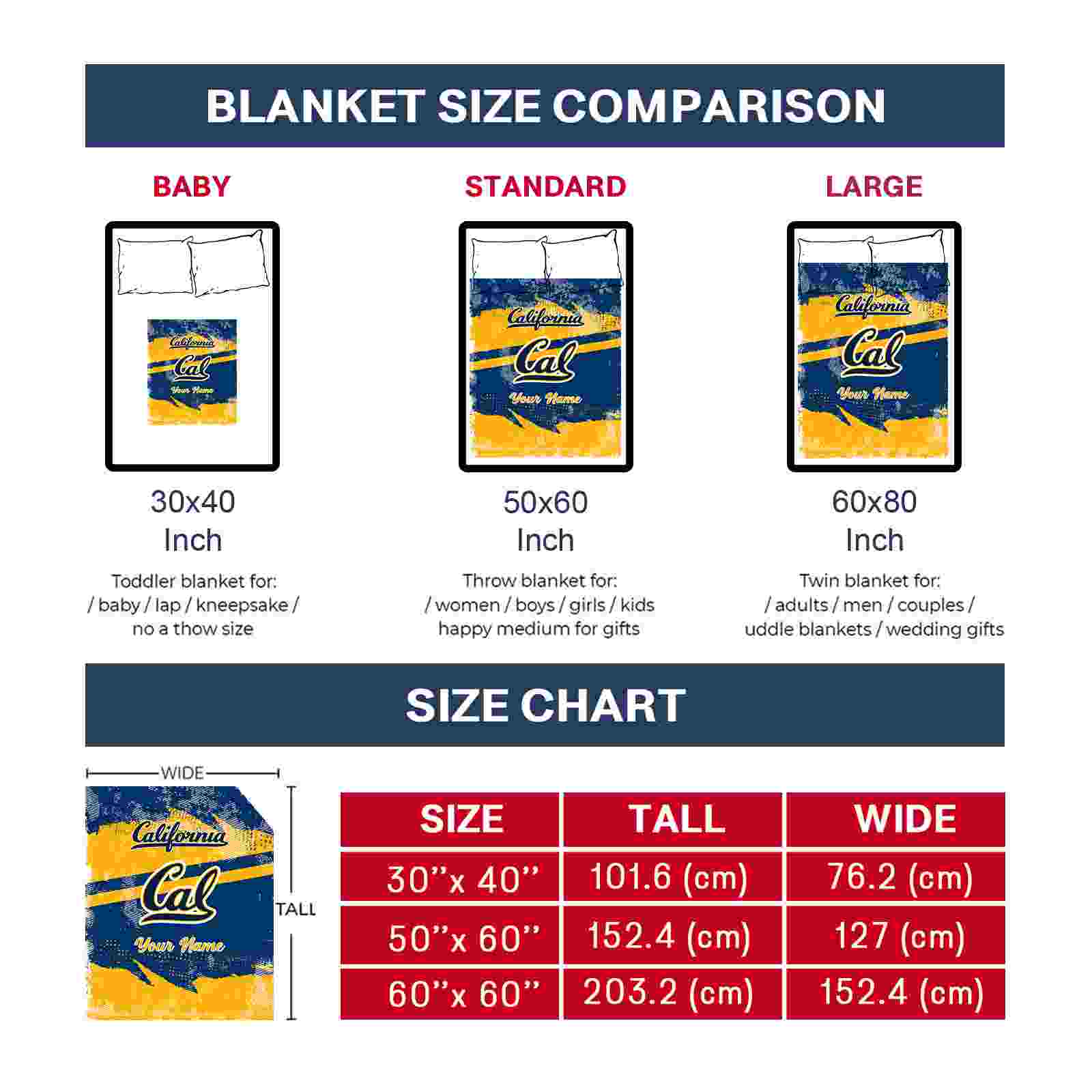 Without a doubt, the Personalized California Golden Bears Grunge Streaks Blue Blanket from California Golden Bears Blankets collection is offering true fans a chance to showcase passion in a cool way. Personalize it with your favorite team’s logo or a meaningful name to make it uniquely yours. Isn’t that great? The full-color print ensures vibrant, edge-to-edge designs, bringing your sports enthusiasm to life!