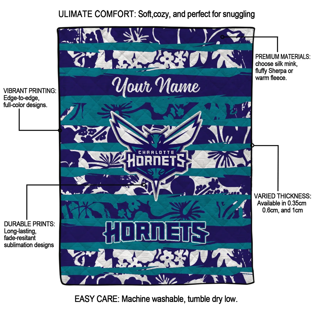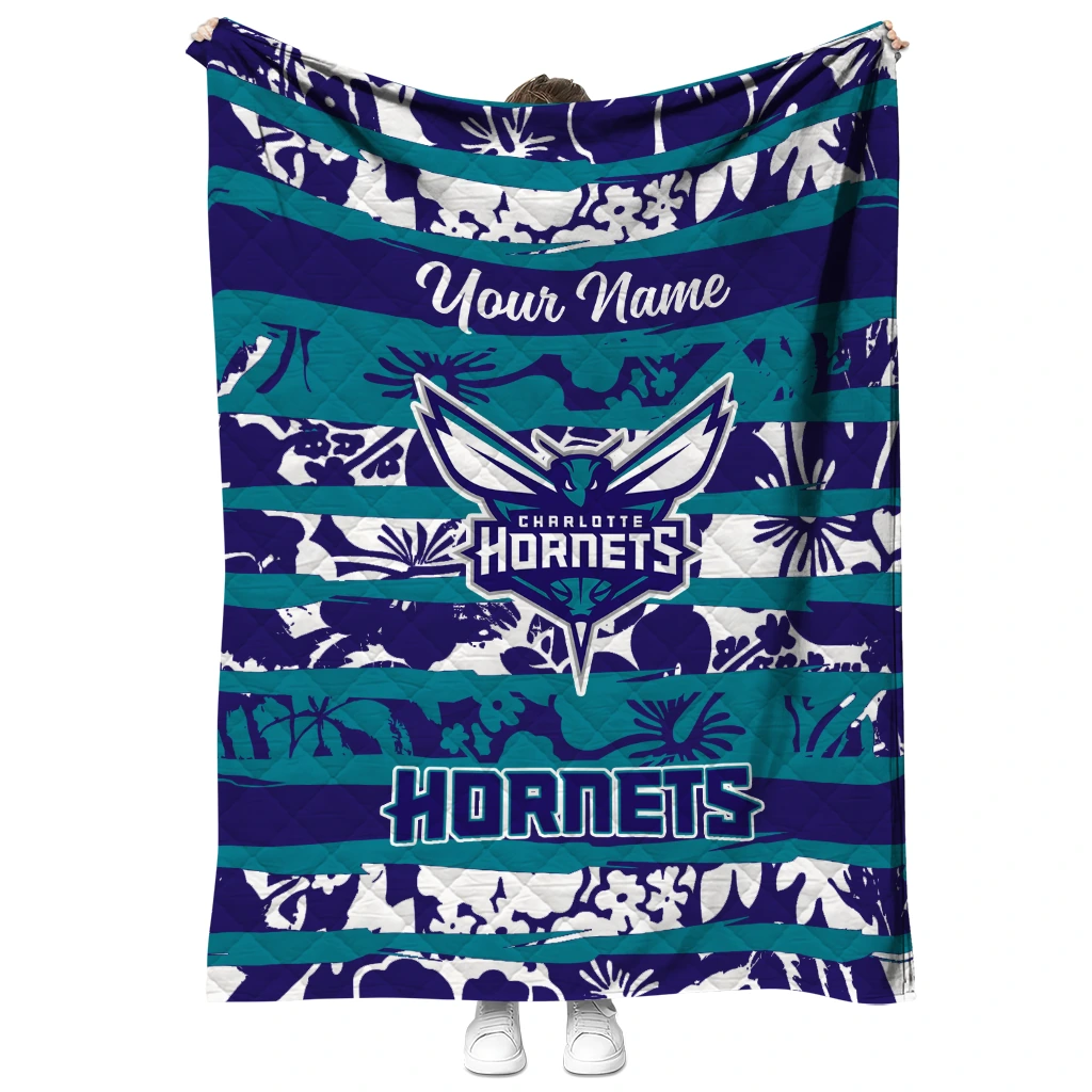 Personalized Charlotte Hornets Layered Florals Teal White Quilt Blanket