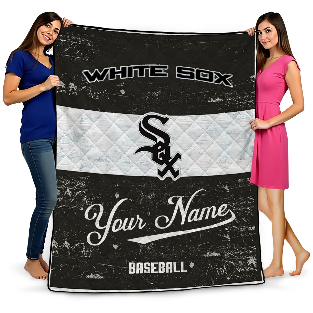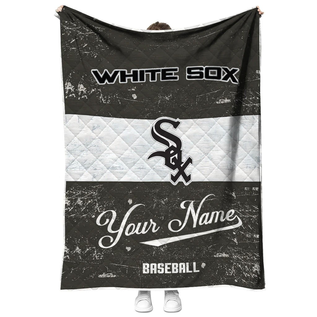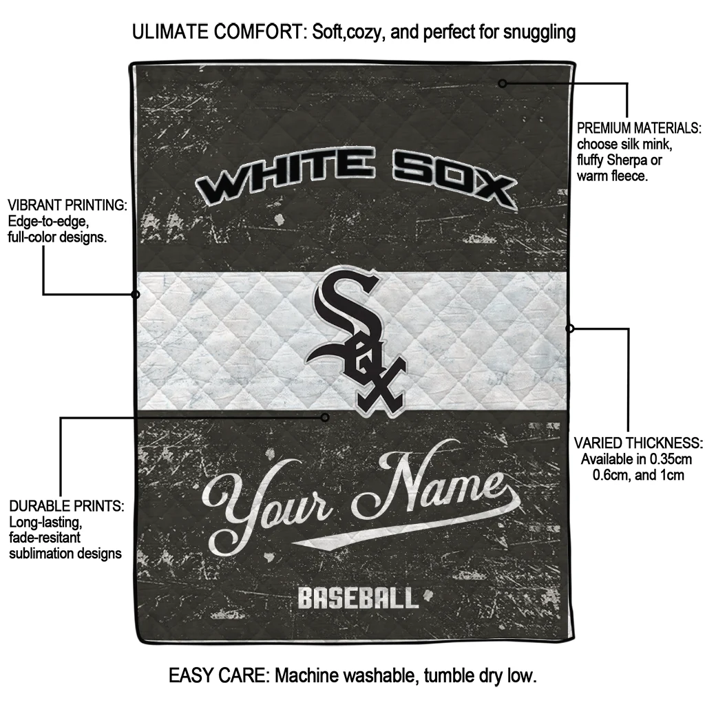 Wrap yourself in warmth and pride with the Personalized Chicago White Sox Snoopy Victory Black White Quilt Blanket from the Chicago White Sox Blankets collection at Yes That Blanket. Made from 100% premium quilting-weight polyester blended with a touch of microfiber, this quilt offers a smooth, soft finish you’ll love. Choose between two quilting styles—Stipple or Diagonal—and enjoy the comfort of a cotton-filled layer inside that adds extra coziness for every season. The border is available in classic black or white, giving your design a clean, timeless edge.