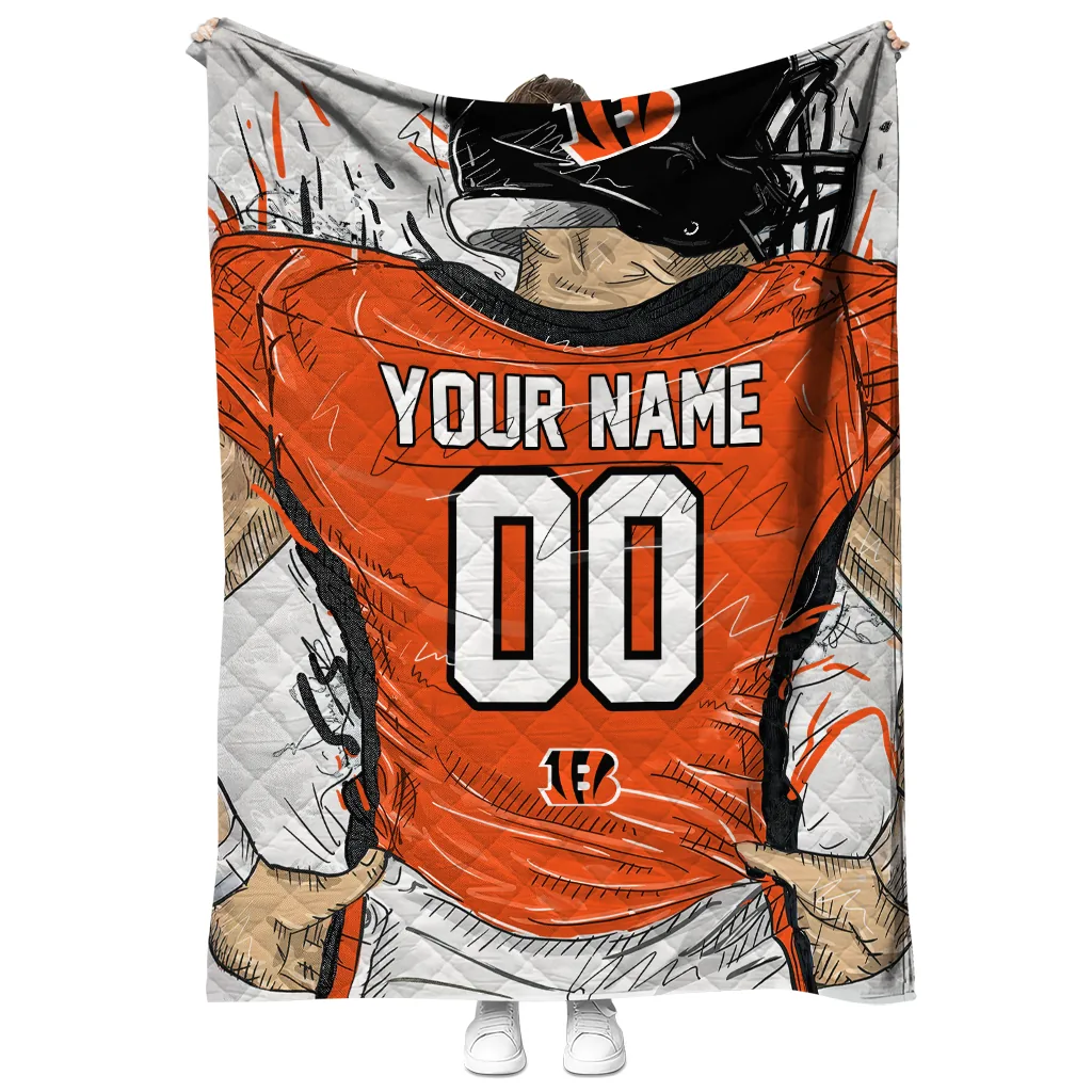 The Personalized Cincinnati Bengals Player Sketch Orange Gray Quilt Blanket is more than a blanket—it’s everyday comfort, thoughtfully made. Crafted from premium quilting fabric with a soft microfiber touch, it offers a smooth hand-feel and lasting coziness. Layered quilting with a cotton-filled core provides adaptable warmth across seasons while maintaining a clean, tailored look on your bed or sofa.