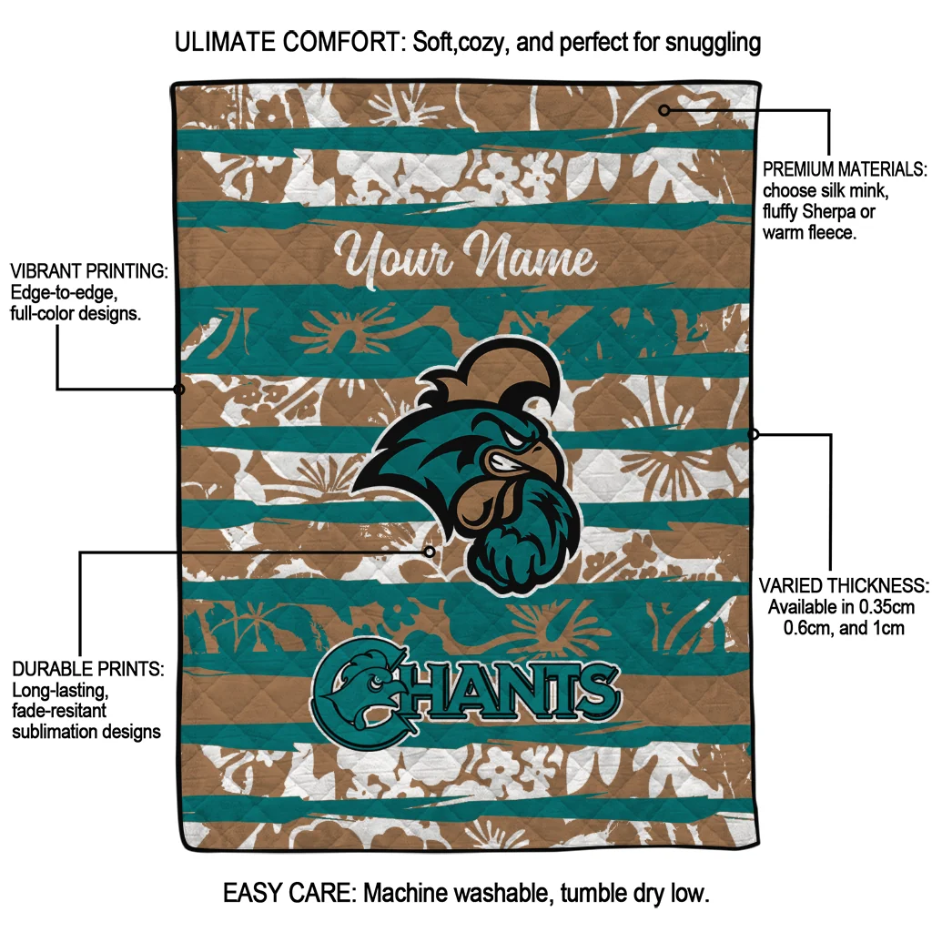 Wrap yourself in warmth and pride with the Personalized Coastal Carolina Chanticleers Layered Florals Green White Quilt Blanket from the Coastal Carolina Chanticleers Blankets collection at Yes That Blanket. Made from 100% premium quilting-weight polyester blended with a touch of microfiber, this quilt offers a smooth, soft finish you’ll love. Choose between two quilting styles—Stipple or Diagonal—and enjoy the comfort of a cotton-filled layer inside that adds extra coziness for every season. The border is available in classic black or white, giving your design a clean, timeless edge.