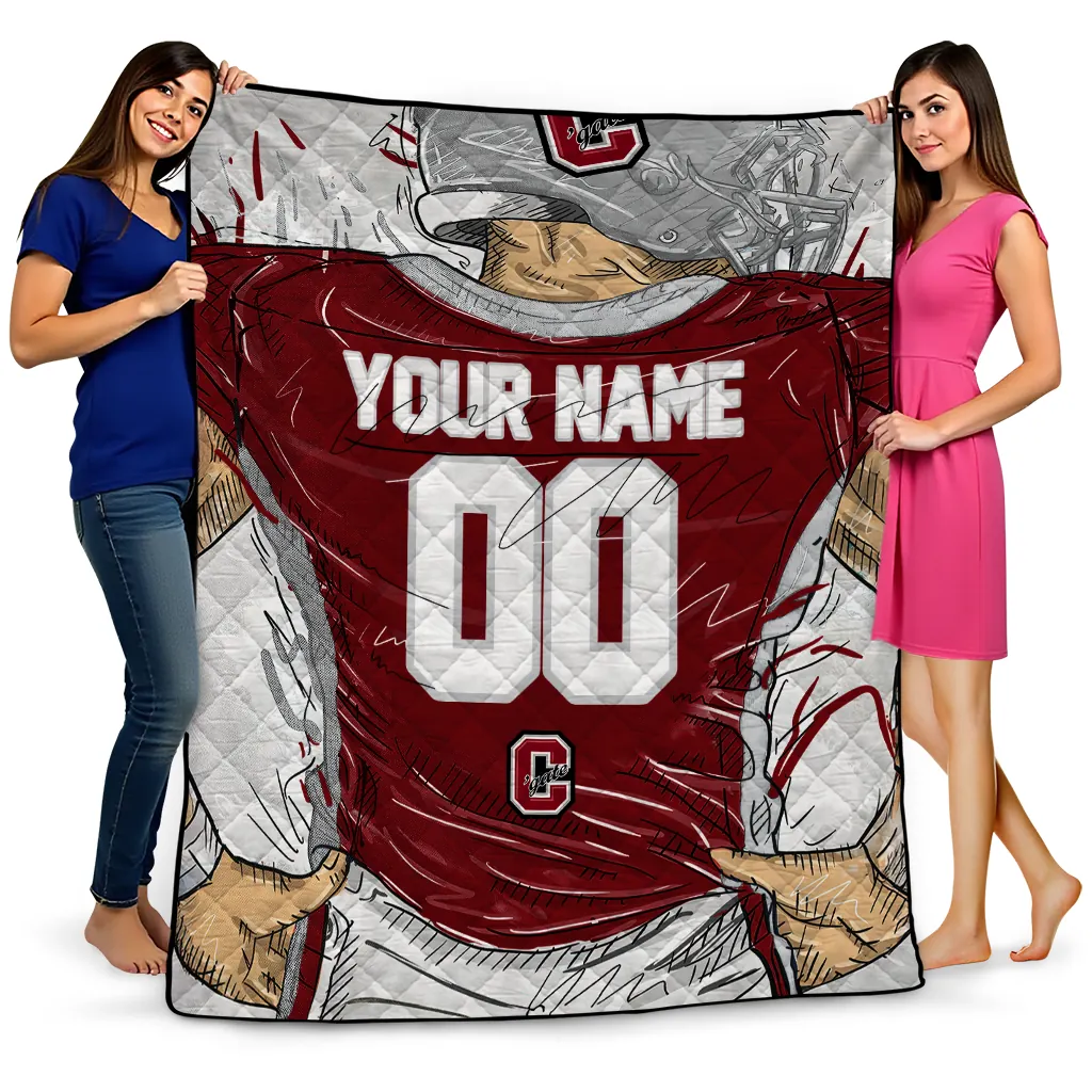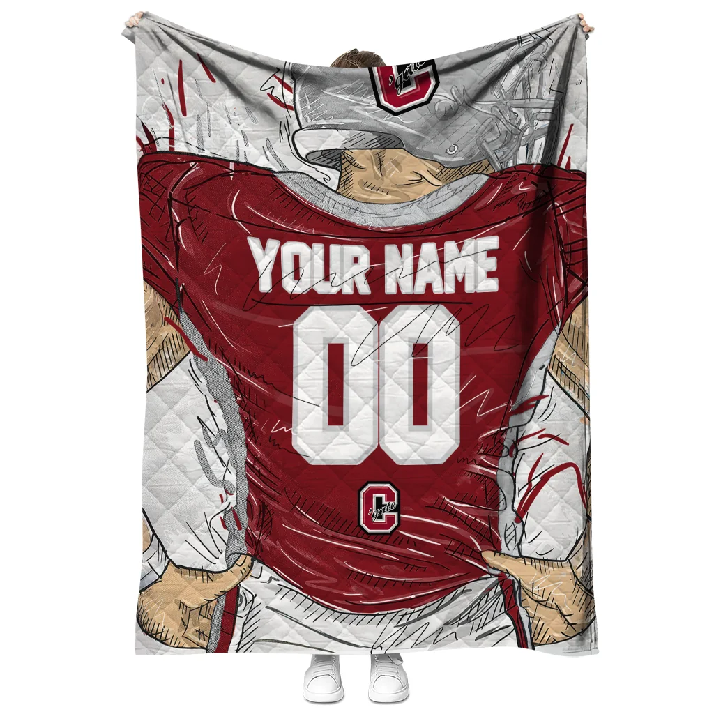Wrap yourself in warmth and pride with the Personalized Colgate Raiders Player Sketch Maroon Gray Quilt Blanket from the Colgate Raiders Blankets collection at Yes That Blanket. Made from 100% premium quilting-weight polyester blended with a touch of microfiber, this quilt offers a smooth, soft finish you’ll love. Choose between two quilting styles—Stipple or Diagonal—and enjoy the comfort of a cotton-filled layer inside that adds extra coziness for every season. The border is available in classic black or white, giving your design a clean, timeless edge.