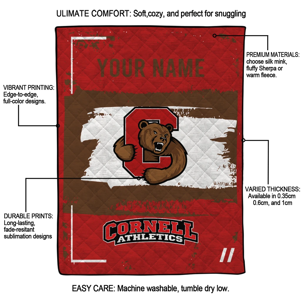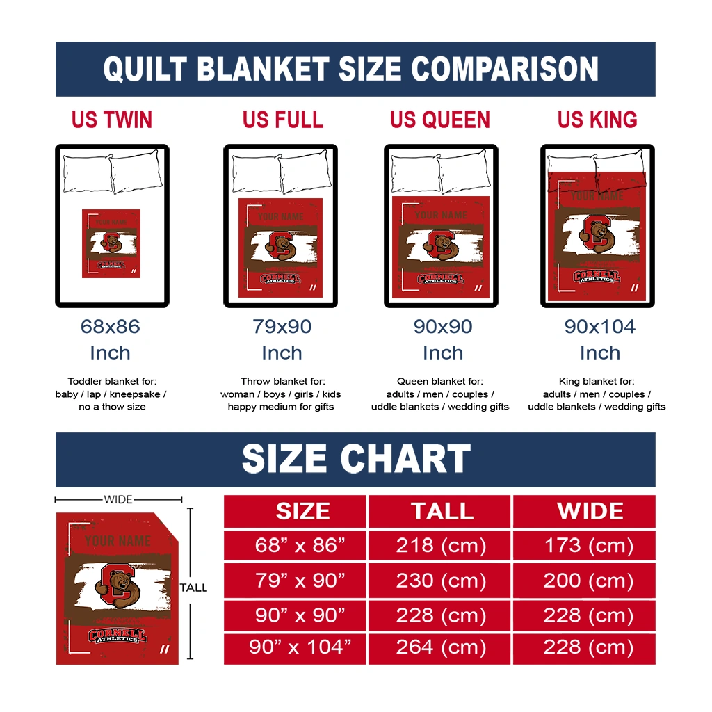 The Personalized Cornell Big Red Grunge Patch Red White Quilt Blanket is more than a blanket—it’s everyday comfort, thoughtfully made. Crafted from premium quilting fabric with a soft microfiber touch, it offers a smooth hand-feel and lasting coziness. Layered quilting with a cotton-filled core provides adaptable warmth across seasons while maintaining a clean, tailored look on your bed or sofa.