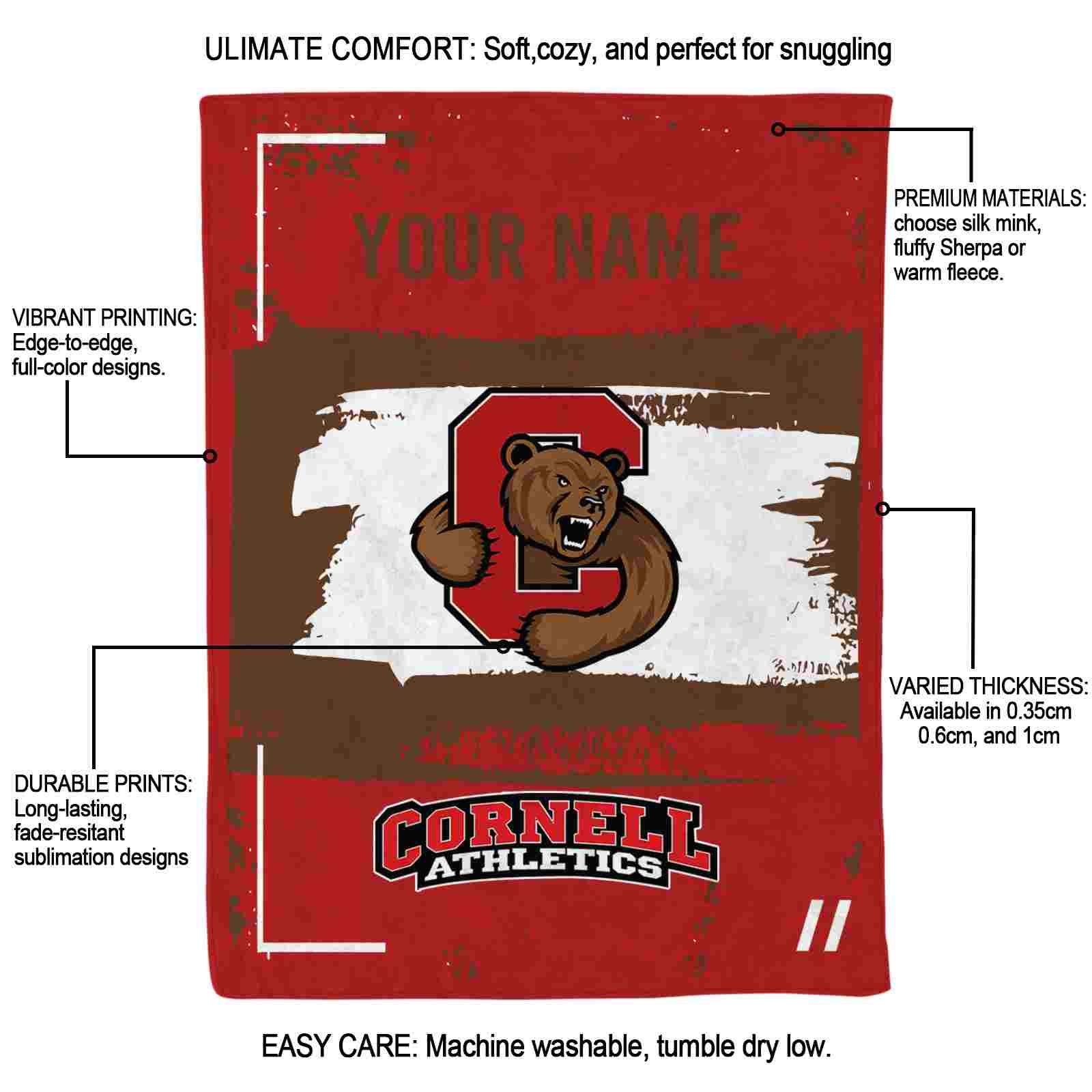 Without a doubt, the Personalized Cornell Big Red Paint Strokes Red White Blanket from Cornell Big Red Blankets collection is offering true fans a chance to showcase passion in a cool way. Personalize it with your favorite team’s logo or a meaningful name to make it uniquely yours. Isn’t that great? The full-color print ensures vibrant, edge-to-edge designs, bringing your sports enthusiasm to life!