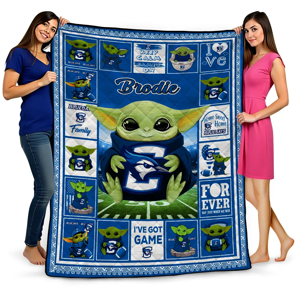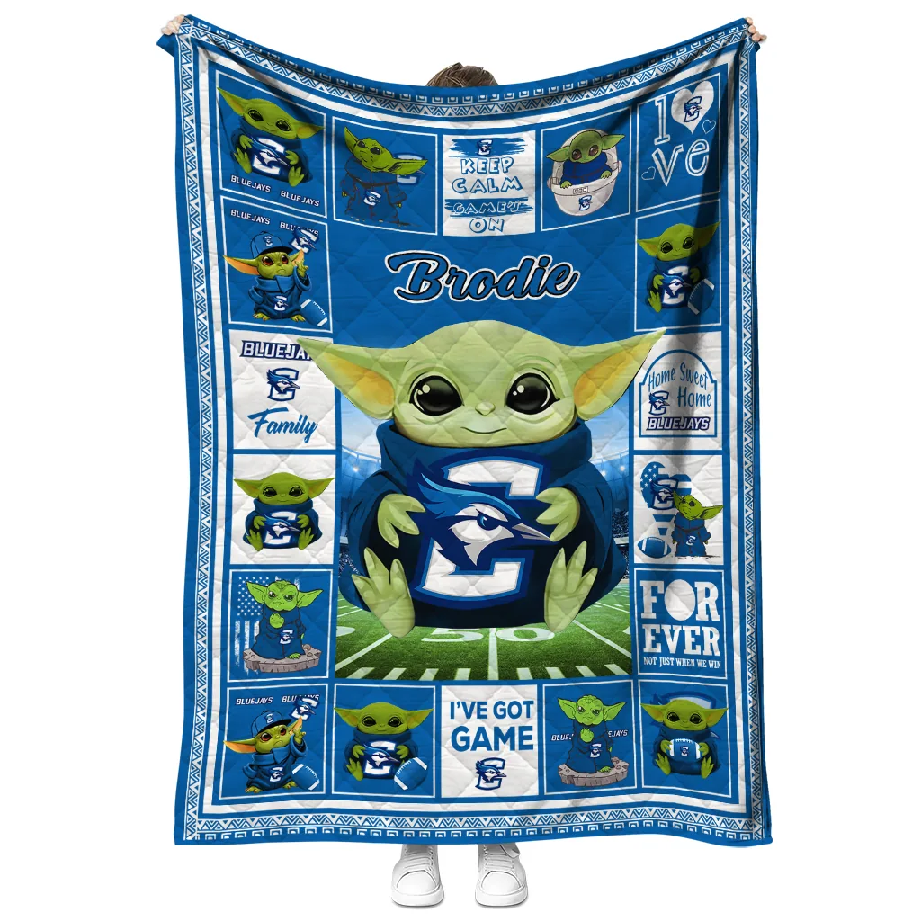 Wrap yourself in warmth and pride with the Personalized Creighton Bluejays Yody Baby Pattern Blue Quilt Blanket from the Creighton Bluejays Blankets collection at Yes That Blanket. Made from 100% premium quilting-weight polyester blended with a touch of microfiber, this quilt offers a smooth, soft finish you’ll love. Choose between two quilting styles—Stipple or Diagonal—and enjoy the comfort of a cotton-filled layer inside that adds extra coziness for every season. The border is available in classic black or white, giving your design a clean, timeless edge.