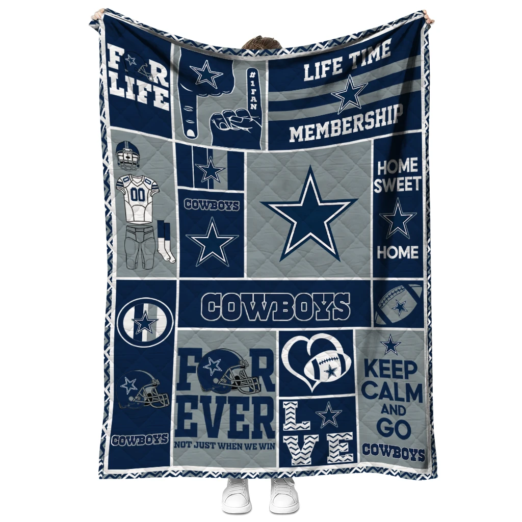 Wrap yourself in warmth and pride with the Personalized Dallas Cowboys Helmet Passion Blue Quilt Blanket from the Dallas Cowboys Blankets collection at Yes That Blanket. Made from 100% premium quilting-weight polyester blended with a touch of microfiber, this quilt offers a smooth, soft finish you’ll love. Choose between two quilting styles—Stipple or Diagonal—and enjoy the comfort of a cotton-filled layer inside that adds extra coziness for every season. The border is available in classic black or white, giving your design a clean, timeless edge.