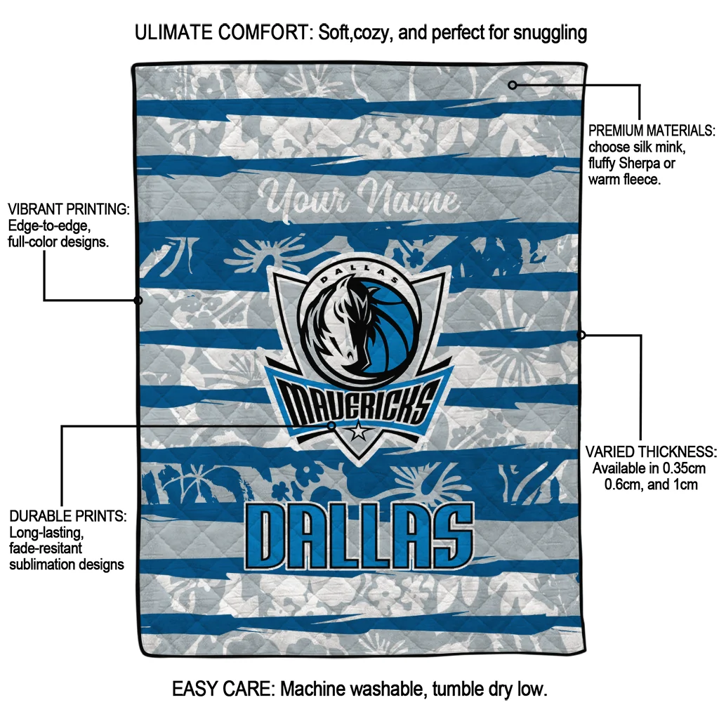 Wrap yourself in warmth and pride with the Personalized Dallas Mavericks Layered Florals Blue White Quilt Blanket from the Dallas Mavericks Blankets collection at Yes That Blanket. Made from 100% premium quilting-weight polyester blended with a touch of microfiber, this quilt offers a smooth, soft finish you’ll love. Choose between two quilting styles—Stipple or Diagonal—and enjoy the comfort of a cotton-filled layer inside that adds extra coziness for every season. The border is available in classic black or white, giving your design a clean, timeless edge.