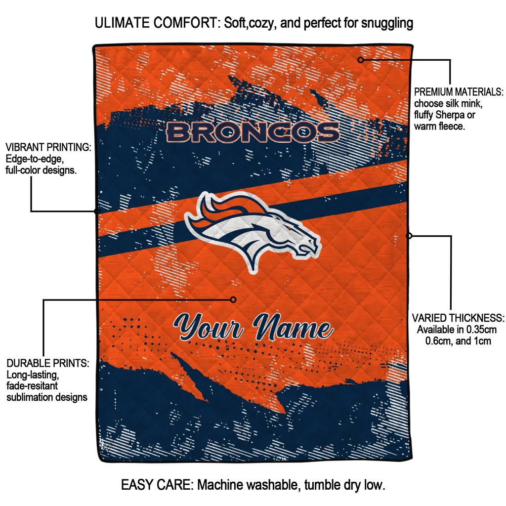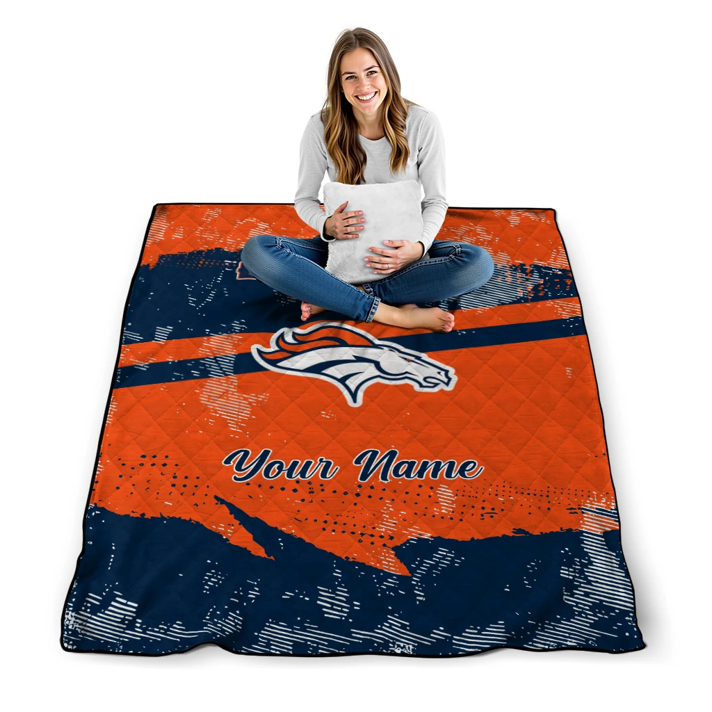 Wrap yourself in warmth and pride with the Personalized Denver Broncos Brushstroke Layers Orange Quilt Blanket from the Denver Broncos Blankets collection at Yes That Blanket. Made from 100% premium quilting-weight polyester blended with a touch of microfiber, this quilt offers a smooth, soft finish you’ll love. Choose between two quilting styles—Stipple or Diagonal—and enjoy the comfort of a cotton-filled layer inside that adds extra coziness for every season. The border is available in classic black or white, giving your design a clean, timeless edge.