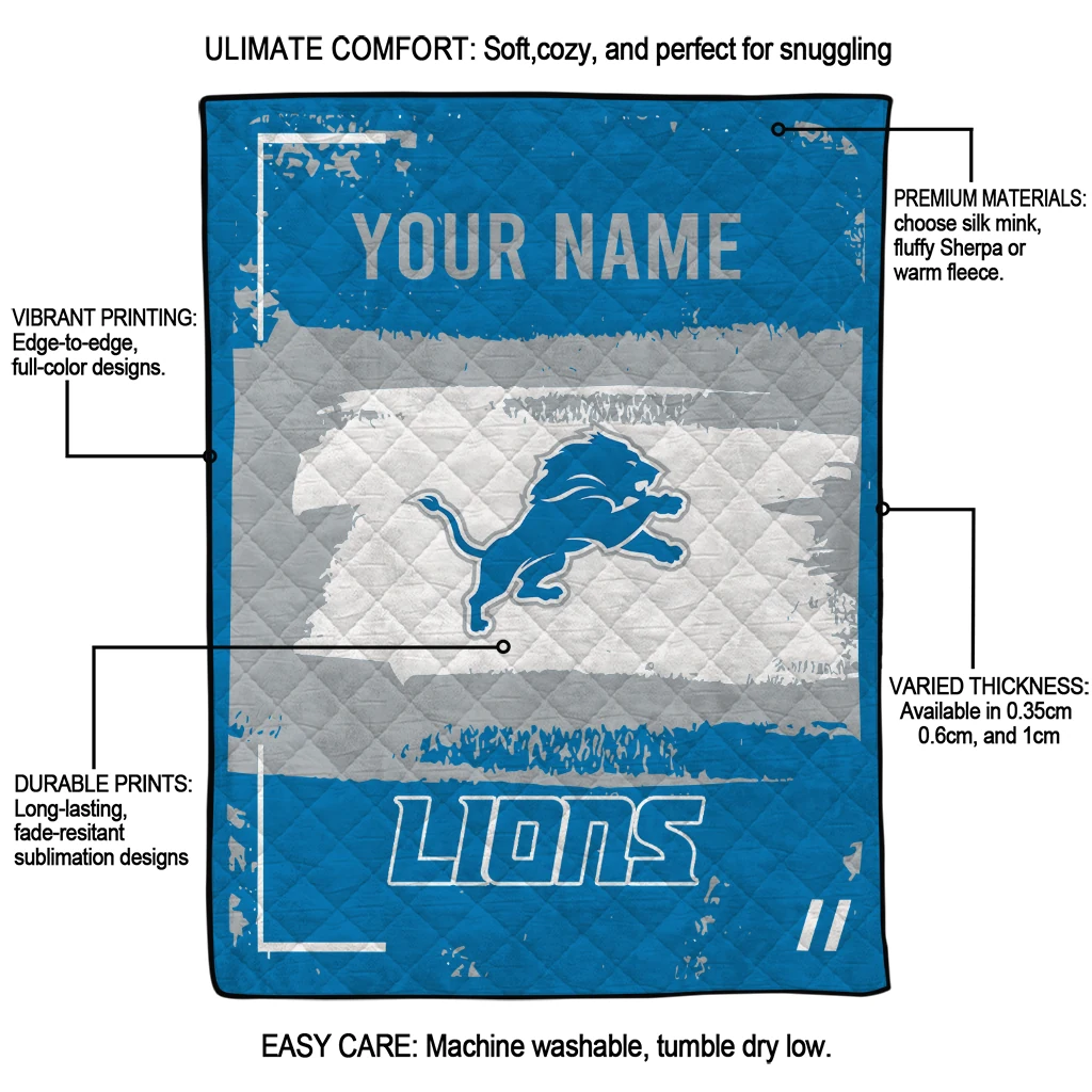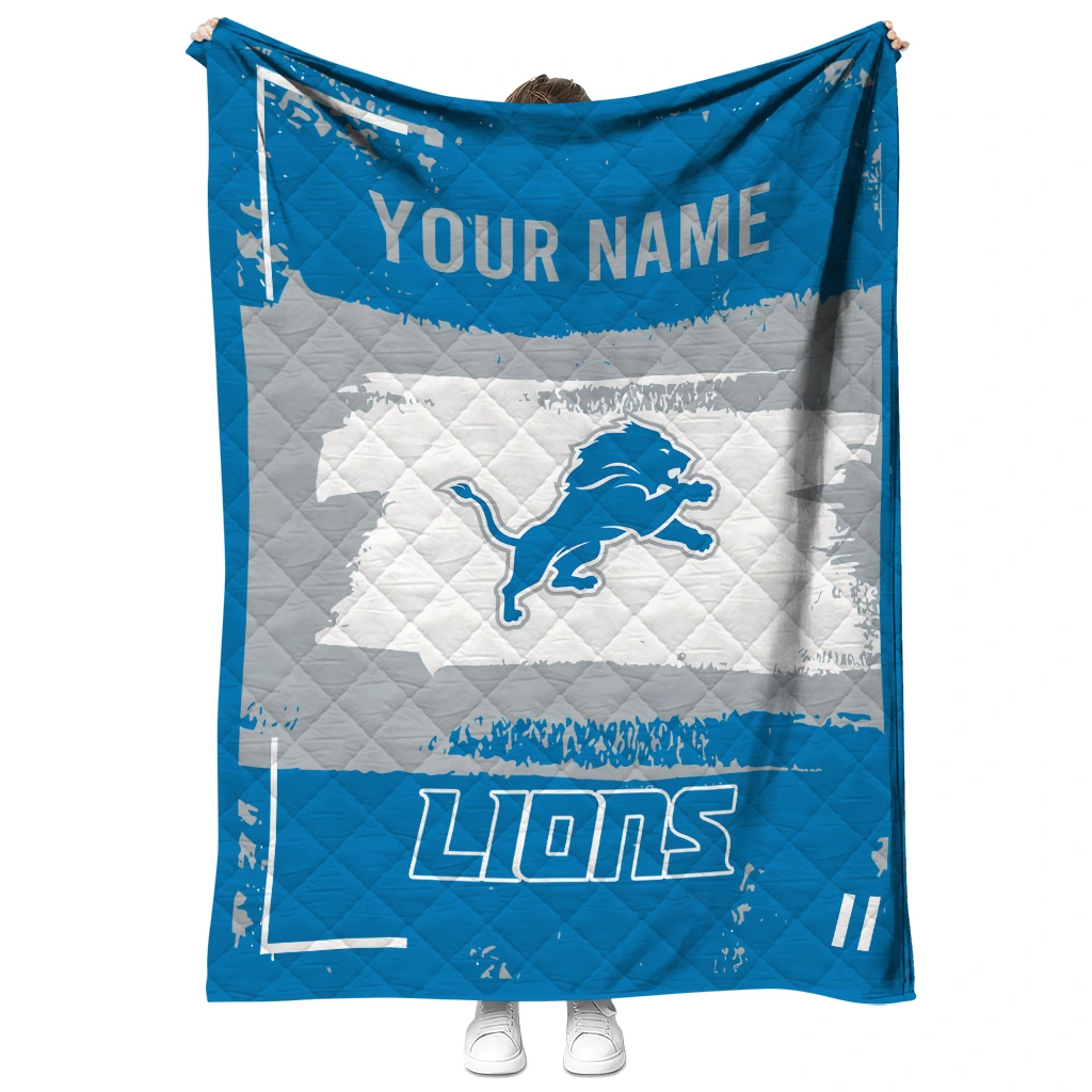 Wrap yourself in warmth and pride with the Personalized Detroit Lions Grunge Patch Blue White Quilt Blanket from the Detroit Lions Blankets collection at Yes That Blanket. Made from 100% premium quilting-weight polyester blended with a touch of microfiber, this quilt offers a smooth, soft finish you’ll love. Choose between two quilting styles—Stipple or Diagonal—and enjoy the comfort of a cotton-filled layer inside that adds extra coziness for every season. The border is available in classic black or white, giving your design a clean, timeless edge.
