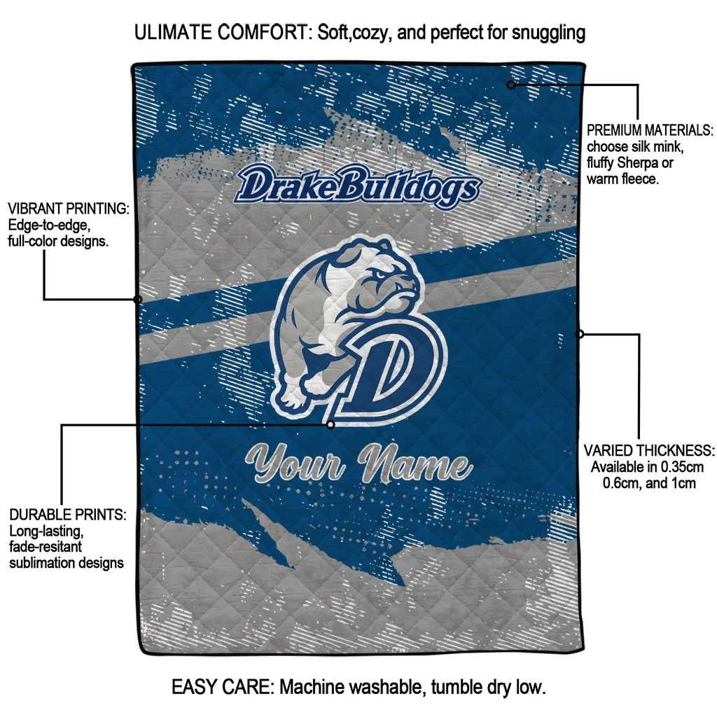 Wrap yourself in warmth and pride with the Personalized Drake Bulldogs Brushstroke Layers Blue Quilt Blanket from the Drake Bulldogs Blankets collection at Yes That Blanket. Made from 100% premium quilting-weight polyester blended with a touch of microfiber, this quilt offers a smooth, soft finish you’ll love. Choose between two quilting styles—Stipple or Diagonal—and enjoy the comfort of a cotton-filled layer inside that adds extra coziness for every season. The border is available in classic black or white, giving your design a clean, timeless edge.