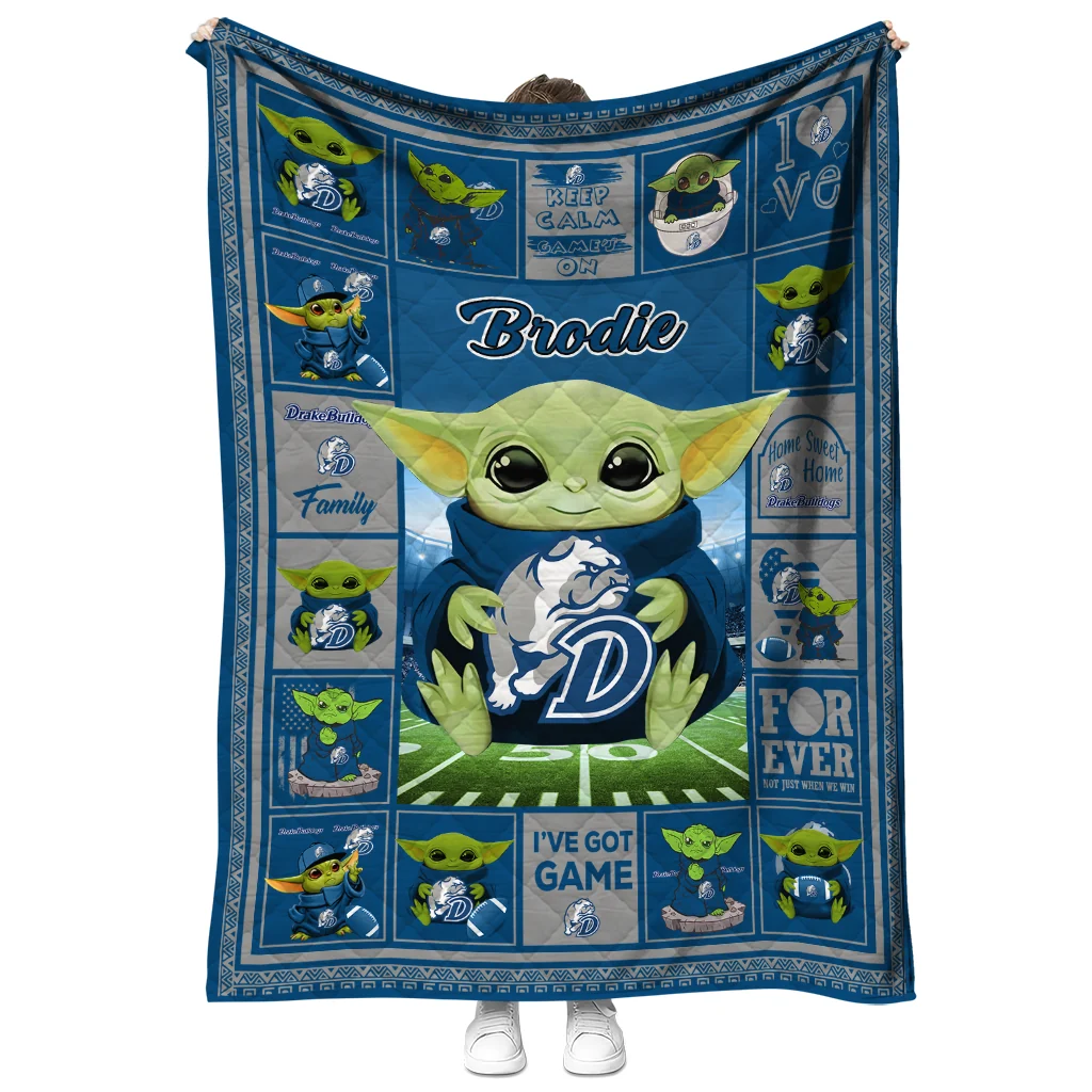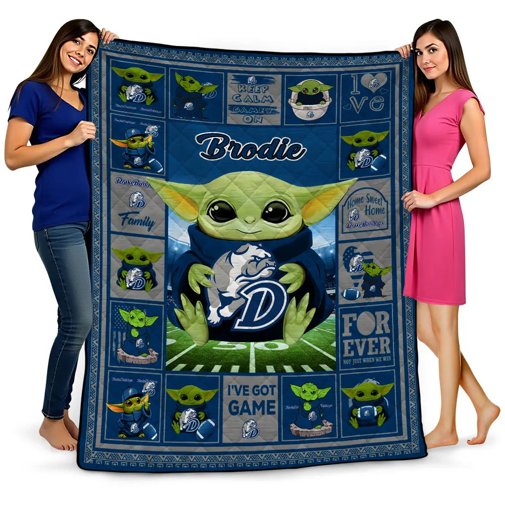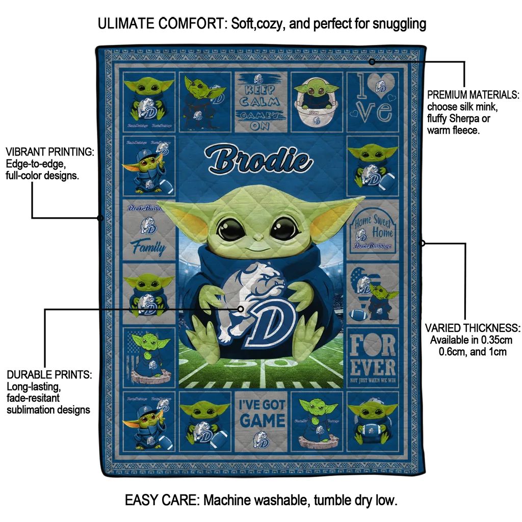 Wrap yourself in warmth and pride with the Personalized Drake Bulldogs Yody Baby Pattern Blue Quilt Blanket from the Drake Bulldogs Blankets collection at Yes That Blanket. Made from 100% premium quilting-weight polyester blended with a touch of microfiber, this quilt offers a smooth, soft finish you’ll love. Choose between two quilting styles—Stipple or Diagonal—and enjoy the comfort of a cotton-filled layer inside that adds extra coziness for every season. The border is available in classic black or white, giving your design a clean, timeless edge.