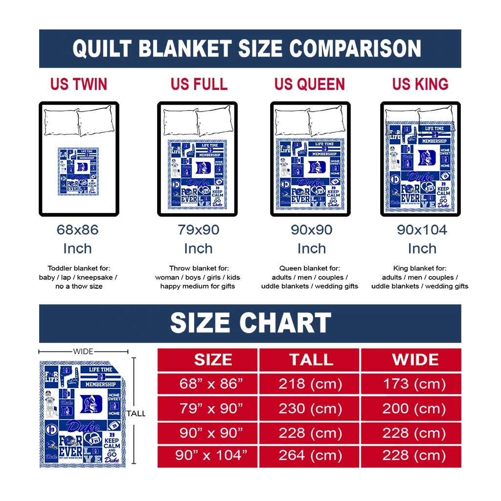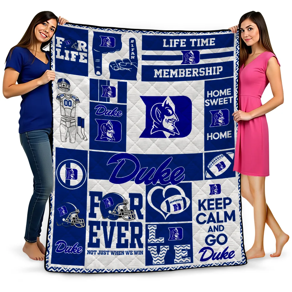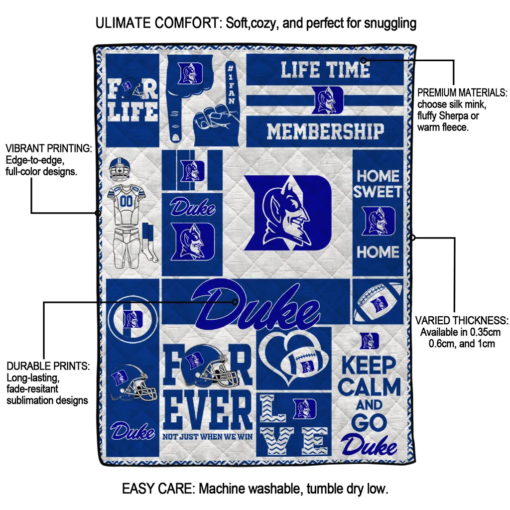 The Personalized Duke Blue Devils Helmet Passion Blue Quilt Blanket is more than a blanket—it’s everyday comfort, thoughtfully made. Crafted from premium quilting fabric with a soft microfiber touch, it offers a smooth hand-feel and lasting coziness. Layered quilting with a cotton-filled core provides adaptable warmth across seasons while maintaining a clean, tailored look on your bed or sofa.
