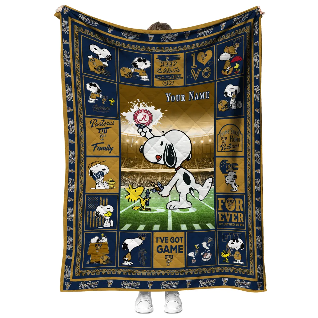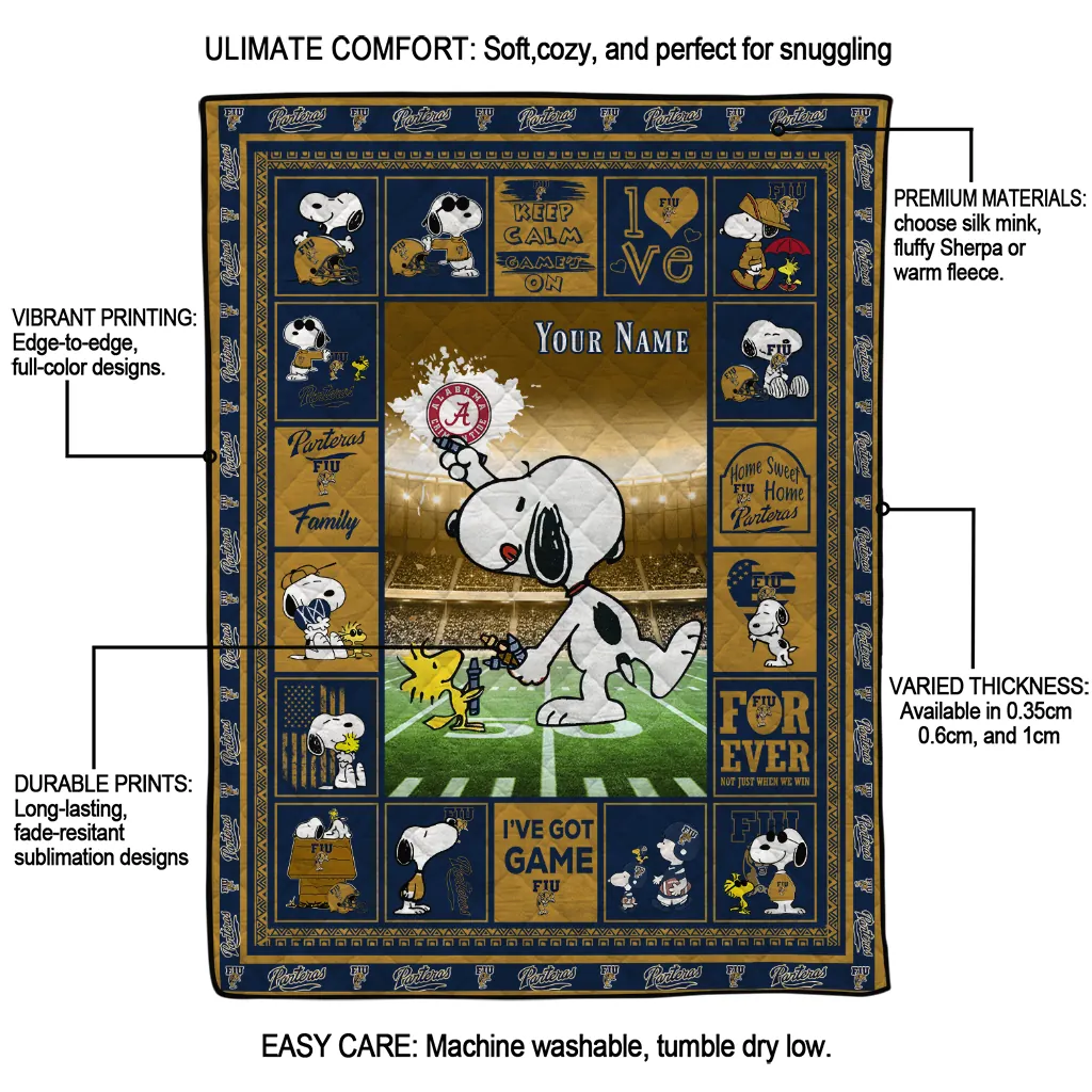 Wrap yourself in warmth and pride with the Personalized FIU Panthers Snoopy Coach Blue Quilt Blanket from the FIU Panthers Blankets collection at Yes That Blanket. Made from 100% premium quilting-weight polyester blended with a touch of microfiber, this quilt offers a smooth, soft finish you’ll love. Choose between two quilting styles—Stipple or Diagonal—and enjoy the comfort of a cotton-filled layer inside that adds extra coziness for every season. The border is available in classic black or white, giving your design a clean, timeless edge.