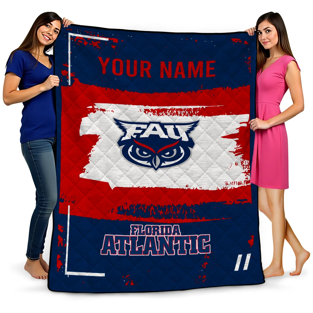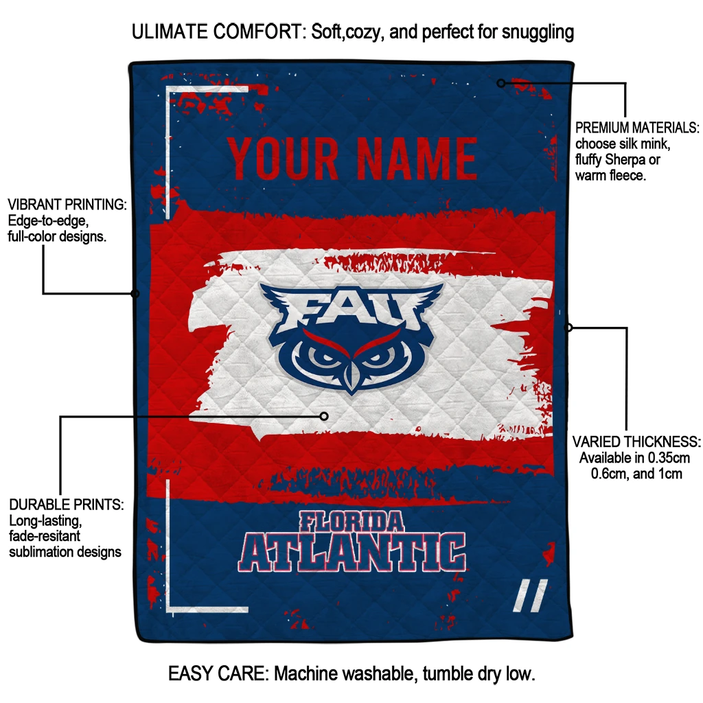 The Personalized Florida Atlantic Owls Grunge Patch Blue White Quilt Blanket is more than a blanket—it’s everyday comfort, thoughtfully made. Crafted from premium quilting fabric with a soft microfiber touch, it offers a smooth hand-feel and lasting coziness. Layered quilting with a cotton-filled core provides adaptable warmth across seasons while maintaining a clean, tailored look on your bed or sofa.