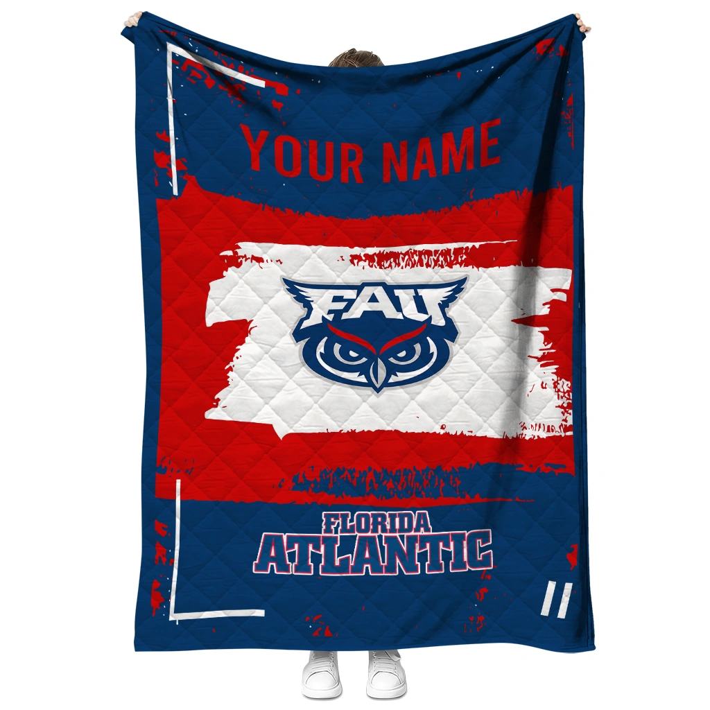 Wrap yourself in warmth and pride with the Personalized Florida Atlantic Owls Grunge Patch Blue White Quilt Blanket from the Florida Atlantic Owls Blankets collection at Yes That Blanket. Made from 100% premium quilting-weight polyester blended with a touch of microfiber, this quilt offers a smooth, soft finish you’ll love. Choose between two quilting styles—Stipple or Diagonal—and enjoy the comfort of a cotton-filled layer inside that adds extra coziness for every season. The border is available in classic black or white, giving your design a clean, timeless edge.
