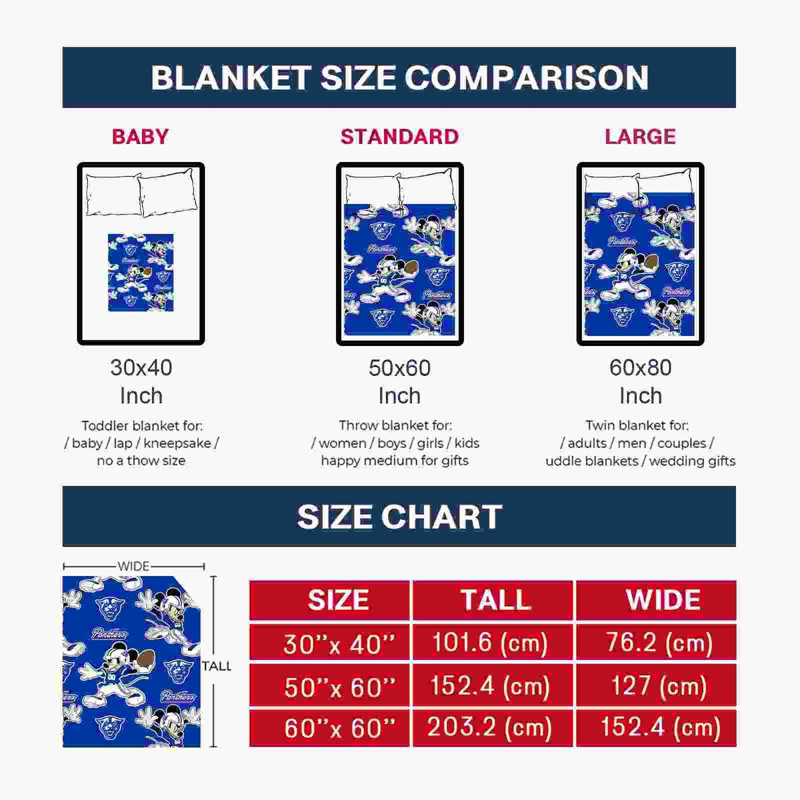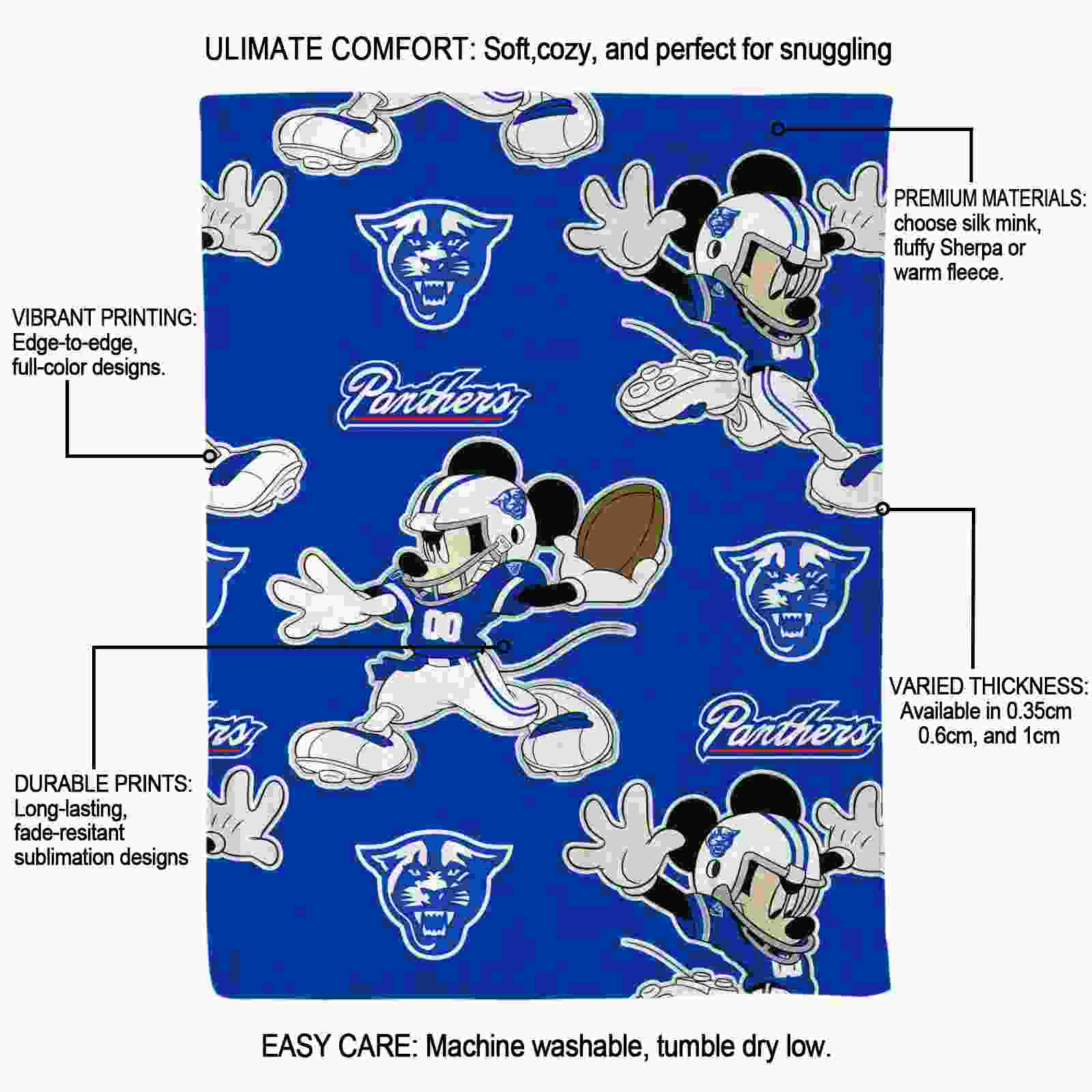 Without a doubt, the Personalized Georgia State Panthers Mickey Blue Blanket from Georgia State Panthers Blankets collection is offering true fans a chance to showcase passion in a cool way. Personalize it with your favorite team’s logo or a meaningful name to make it uniquely yours. Isn’t that great? The full-color print ensures vibrant, edge-to-edge designs, bringing your sports enthusiasm to life!