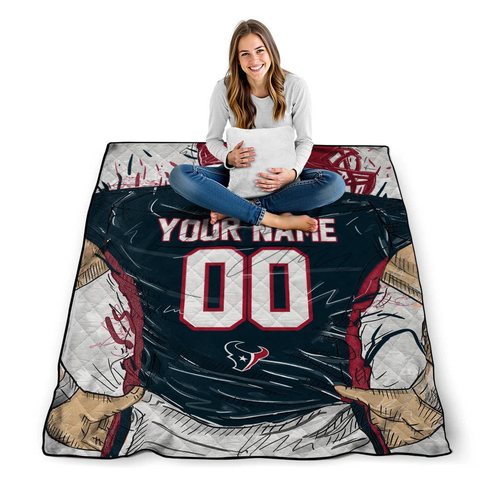 Personalized Houston Texans Player Sketch Blue Gray Quilt Blanket