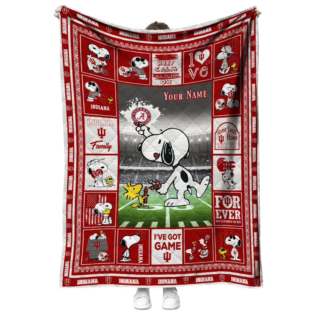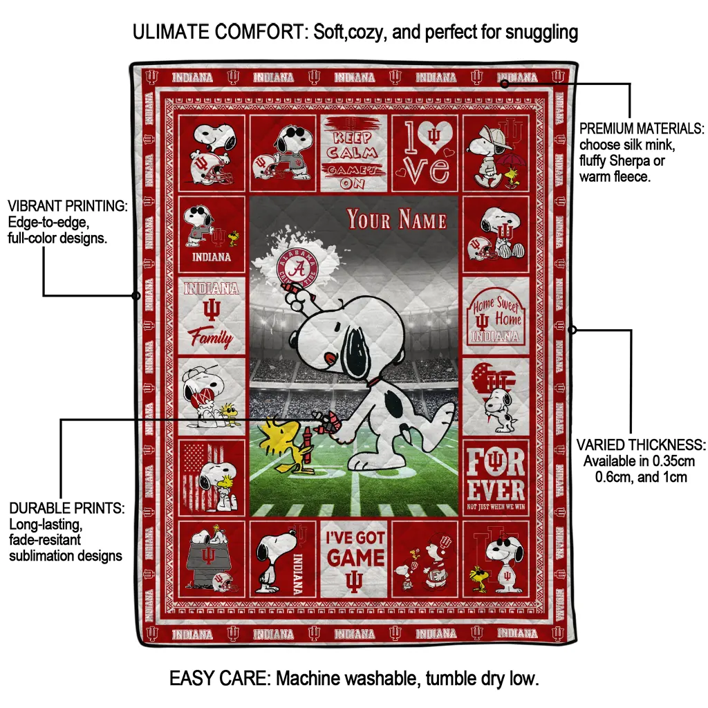Wrap yourself in warmth and pride with the Personalized Indiana Hoosiers Snoopy Coach Red Quilt Blanket from the Indiana Hoosiers Blankets collection at Yes That Blanket. Made from 100% premium quilting-weight polyester blended with a touch of microfiber, this quilt offers a smooth, soft finish you’ll love. Choose between two quilting styles—Stipple or Diagonal—and enjoy the comfort of a cotton-filled layer inside that adds extra coziness for every season. The border is available in classic black or white, giving your design a clean, timeless edge.