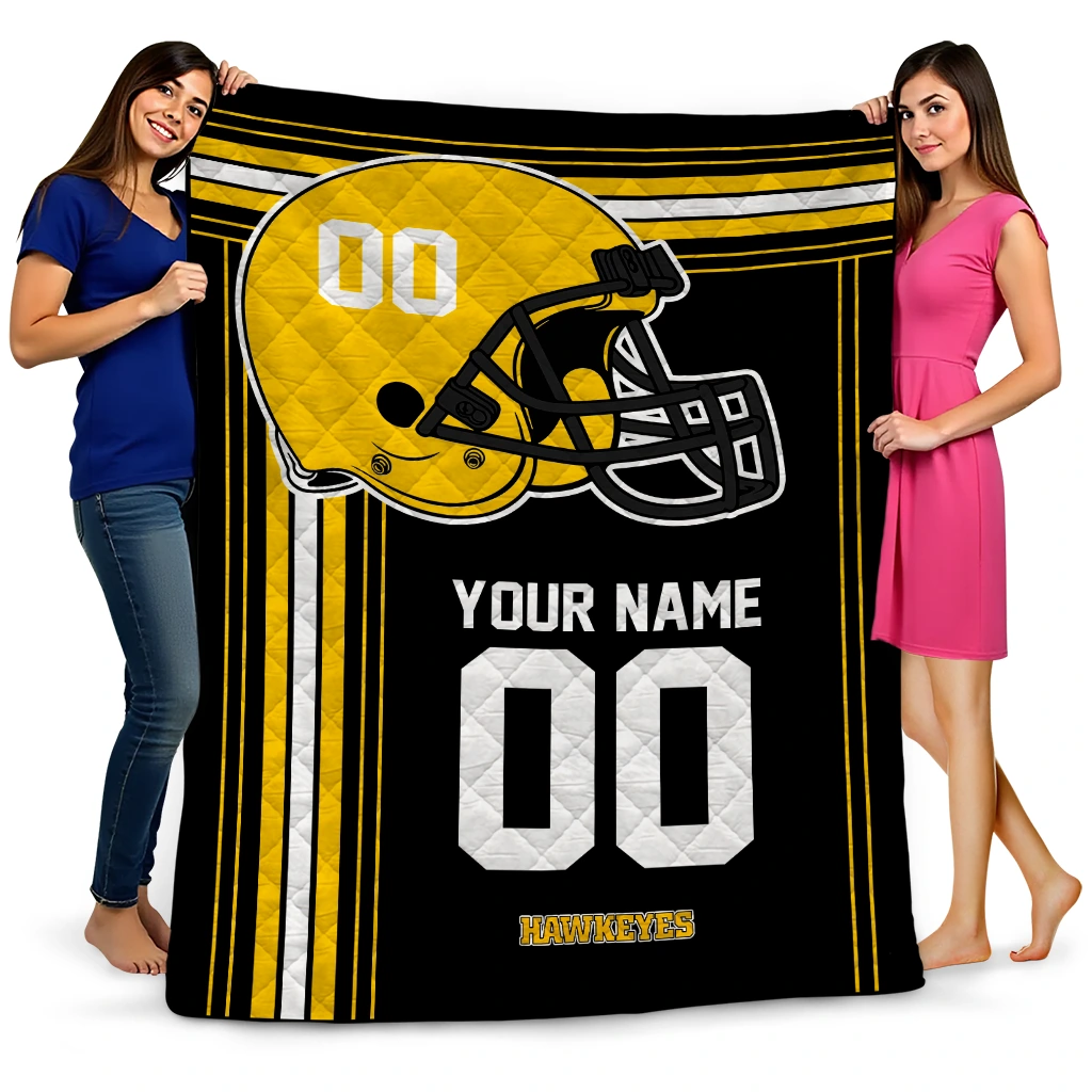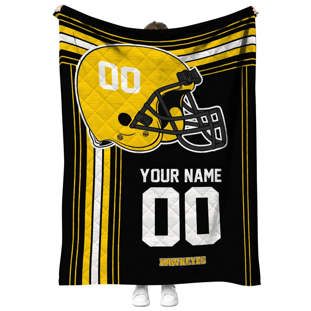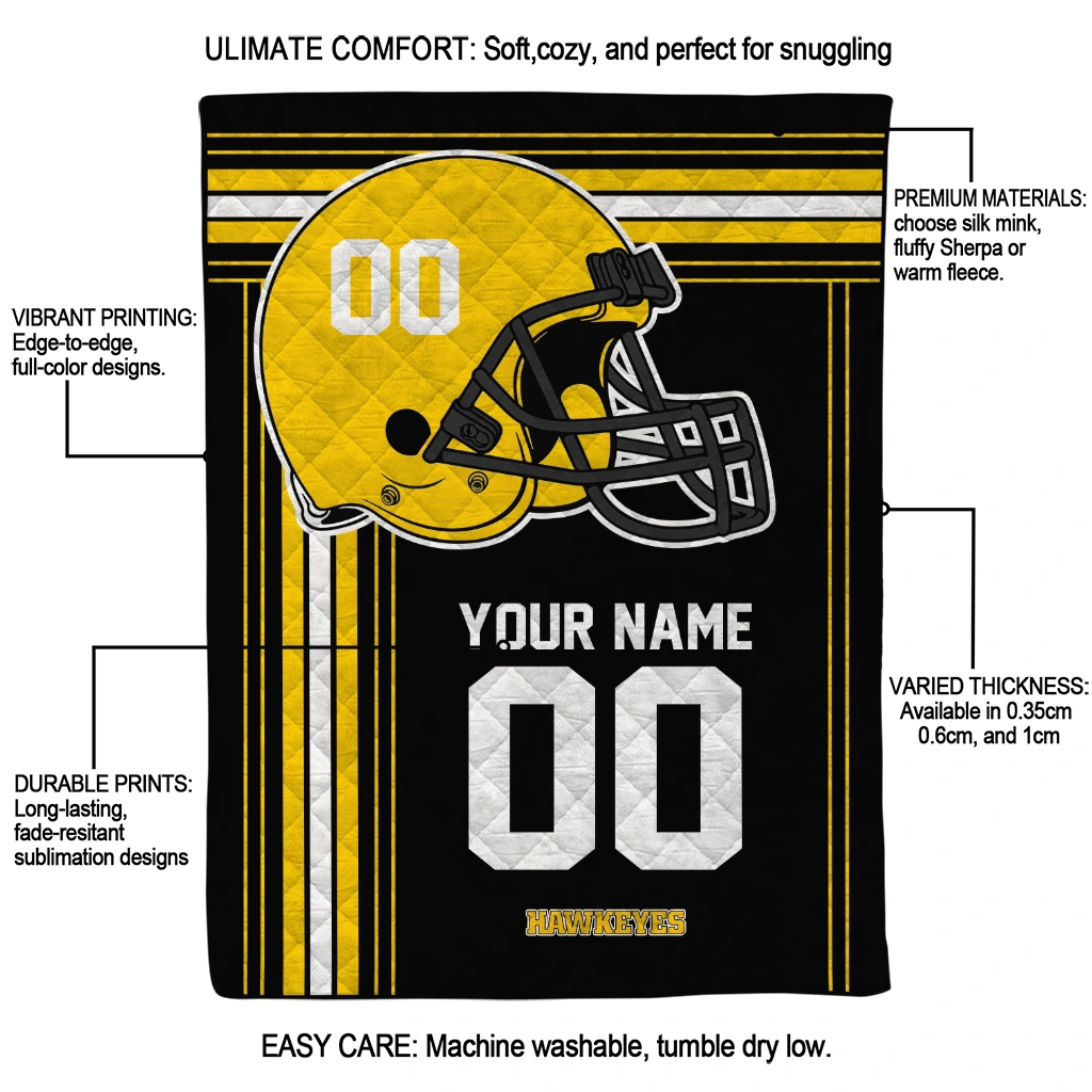 Wrap yourself in warmth and pride with the Personalized Iowa Hawkeyes Helmet Theme Black Quilt Blanket from the Iowa Hawkeyes Blankets collection at Yes That Blanket. Made from 100% premium quilting-weight polyester blended with a touch of microfiber, this quilt offers a smooth, soft finish you’ll love. Choose between two quilting styles—Stipple or Diagonal—and enjoy the comfort of a cotton-filled layer inside that adds extra coziness for every season. The border is available in classic black or white, giving your design a clean, timeless edge.