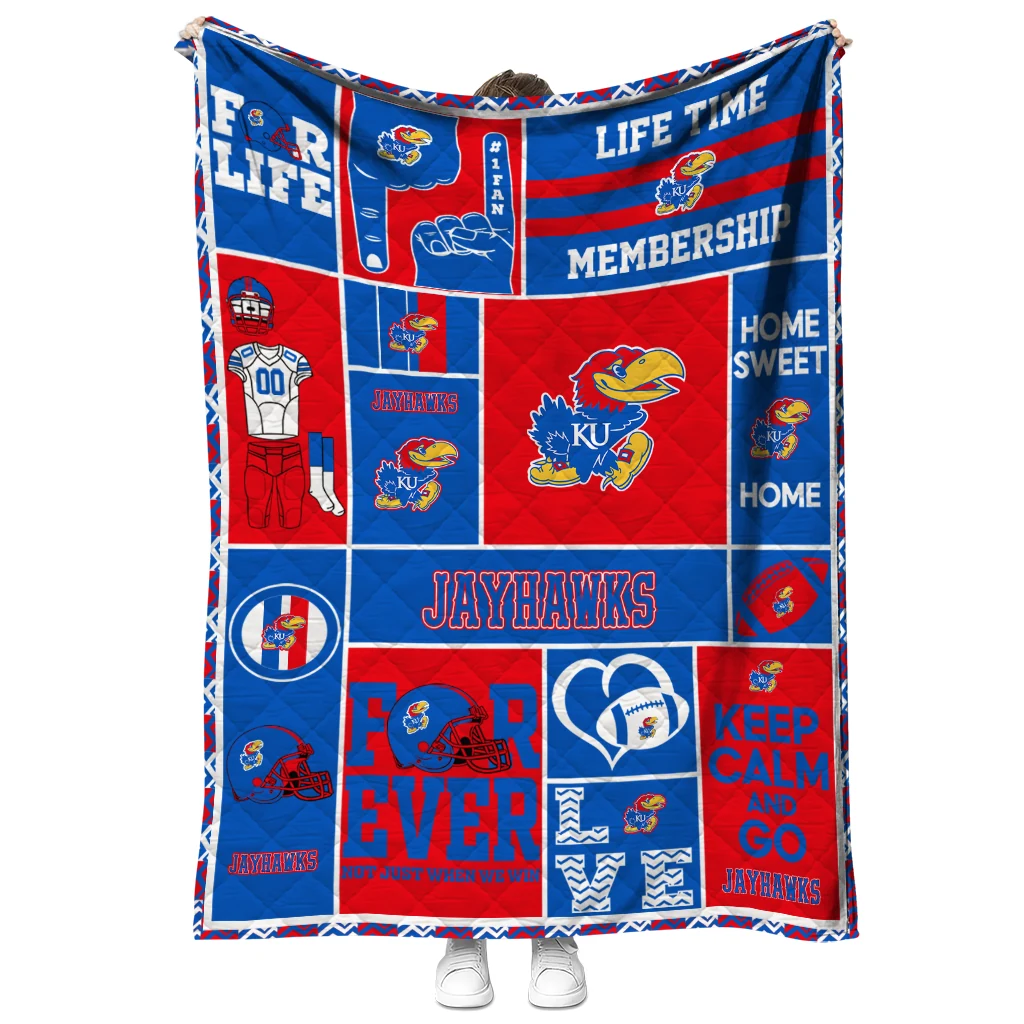 Wrap yourself in warmth and pride with the Personalized Kansas Jayhawks Helmet Passion Blue Quilt Blanket from the Kansas Jayhawks Blankets collection at Yes That Blanket. Made from 100% premium quilting-weight polyester blended with a touch of microfiber, this quilt offers a smooth, soft finish you’ll love. Choose between two quilting styles—Stipple or Diagonal—and enjoy the comfort of a cotton-filled layer inside that adds extra coziness for every season. The border is available in classic black or white, giving your design a clean, timeless edge.