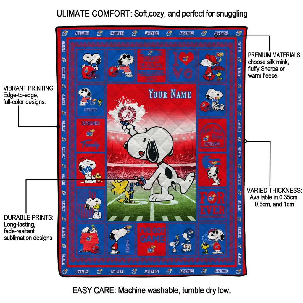 Wrap yourself in warmth and pride with the Personalized Kansas Jayhawks Snoopy Coach Blue Quilt Blanket from the Kansas Jayhawks Blankets collection at Yes That Blanket. Made from 100% premium quilting-weight polyester blended with a touch of microfiber, this quilt offers a smooth, soft finish you’ll love. Choose between two quilting styles—Stipple or Diagonal—and enjoy the comfort of a cotton-filled layer inside that adds extra coziness for every season. The border is available in classic black or white, giving your design a clean, timeless edge.