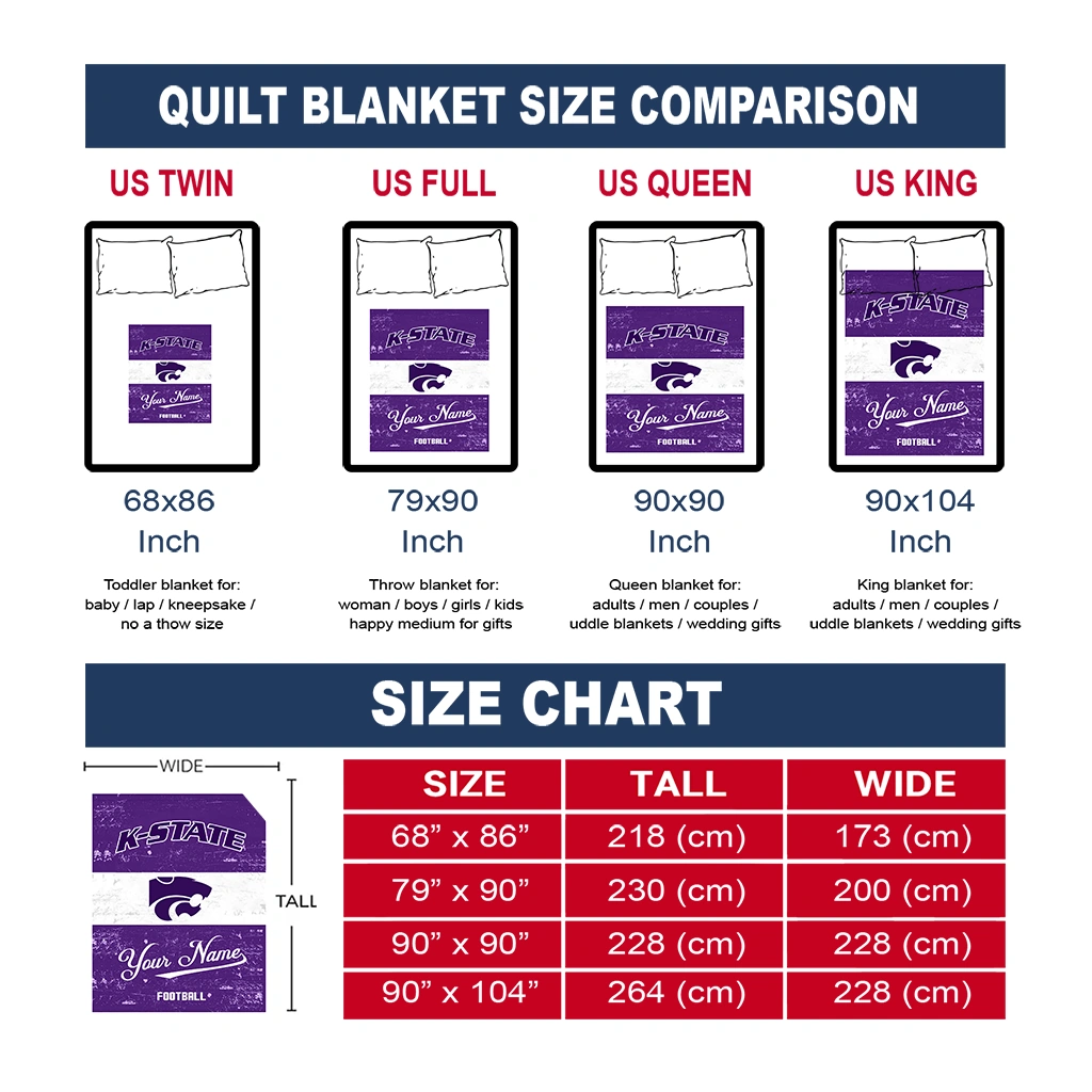The Personalized Kansas State Wildcats Hibiscus Burst Purple White Quilt Blanket is more than a blanket—it’s everyday comfort, thoughtfully made. Crafted from premium quilting fabric with a soft microfiber touch, it offers a smooth hand-feel and lasting coziness. Layered quilting with a cotton-filled core provides adaptable warmth across seasons while maintaining a clean, tailored look on your bed or sofa.