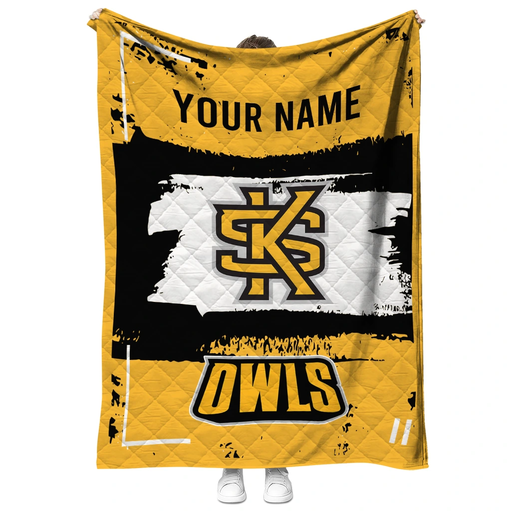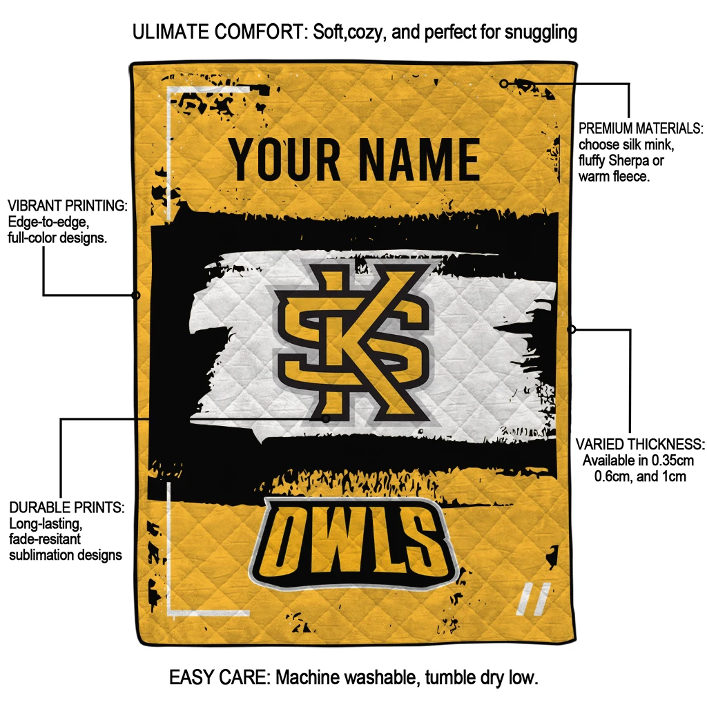 Wrap yourself in warmth and pride with the Personalized Kennesaw State Owls Grunge Patch Gold White Quilt Blanket from the Kennesaw State Owls Blankets collection at Yes That Blanket. Made from 100% premium quilting-weight polyester blended with a touch of microfiber, this quilt offers a smooth, soft finish you’ll love. Choose between two quilting styles—Stipple or Diagonal—and enjoy the comfort of a cotton-filled layer inside that adds extra coziness for every season. The border is available in classic black or white, giving your design a clean, timeless edge.