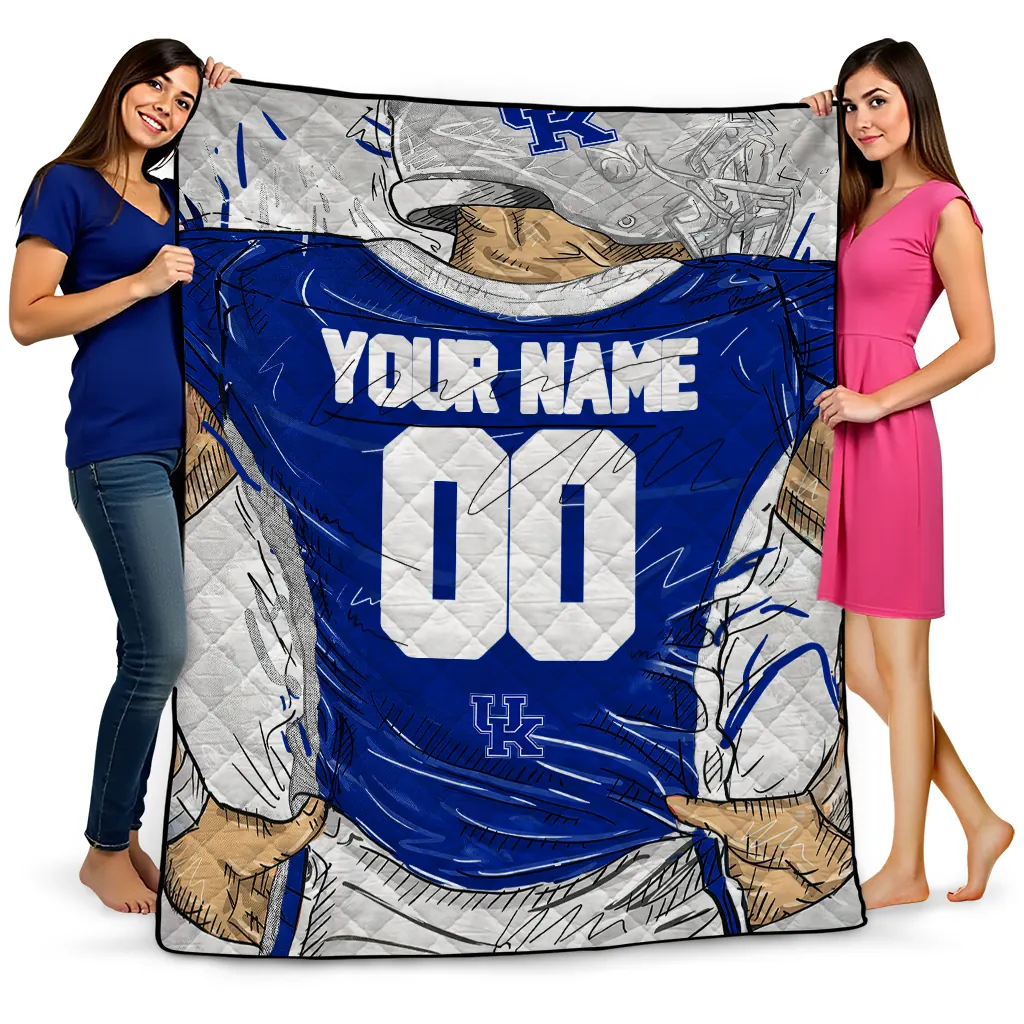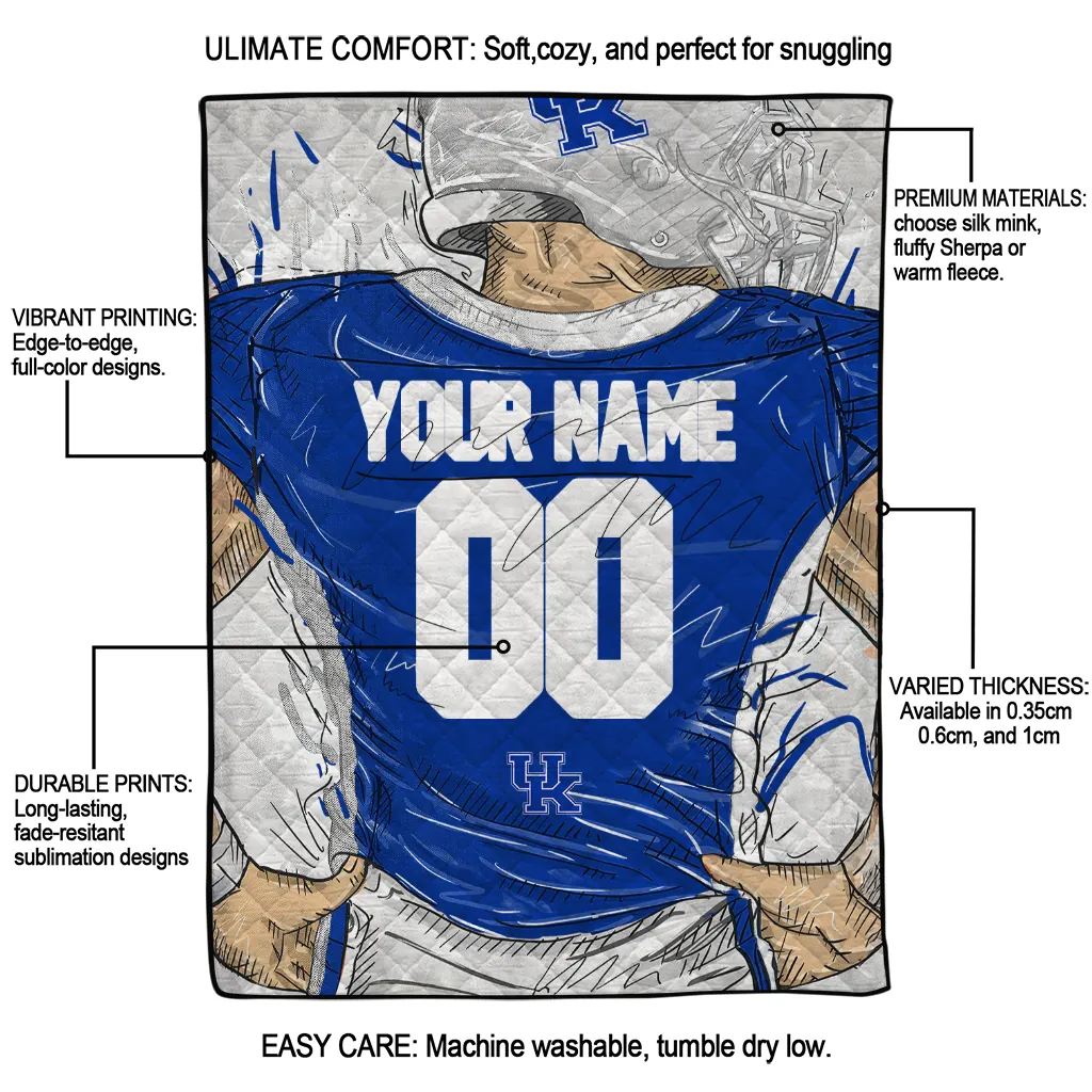Wrap yourself in warmth and pride with the Personalized Kentucky Wildcats Player Sketch Blue Gray Quilt Blanket from the Kentucky Wildcats Blankets collection at Yes That Blanket. Made from 100% premium quilting-weight polyester blended with a touch of microfiber, this quilt offers a smooth, soft finish you’ll love. Choose between two quilting styles—Stipple or Diagonal—and enjoy the comfort of a cotton-filled layer inside that adds extra coziness for every season. The border is available in classic black or white, giving your design a clean, timeless edge.