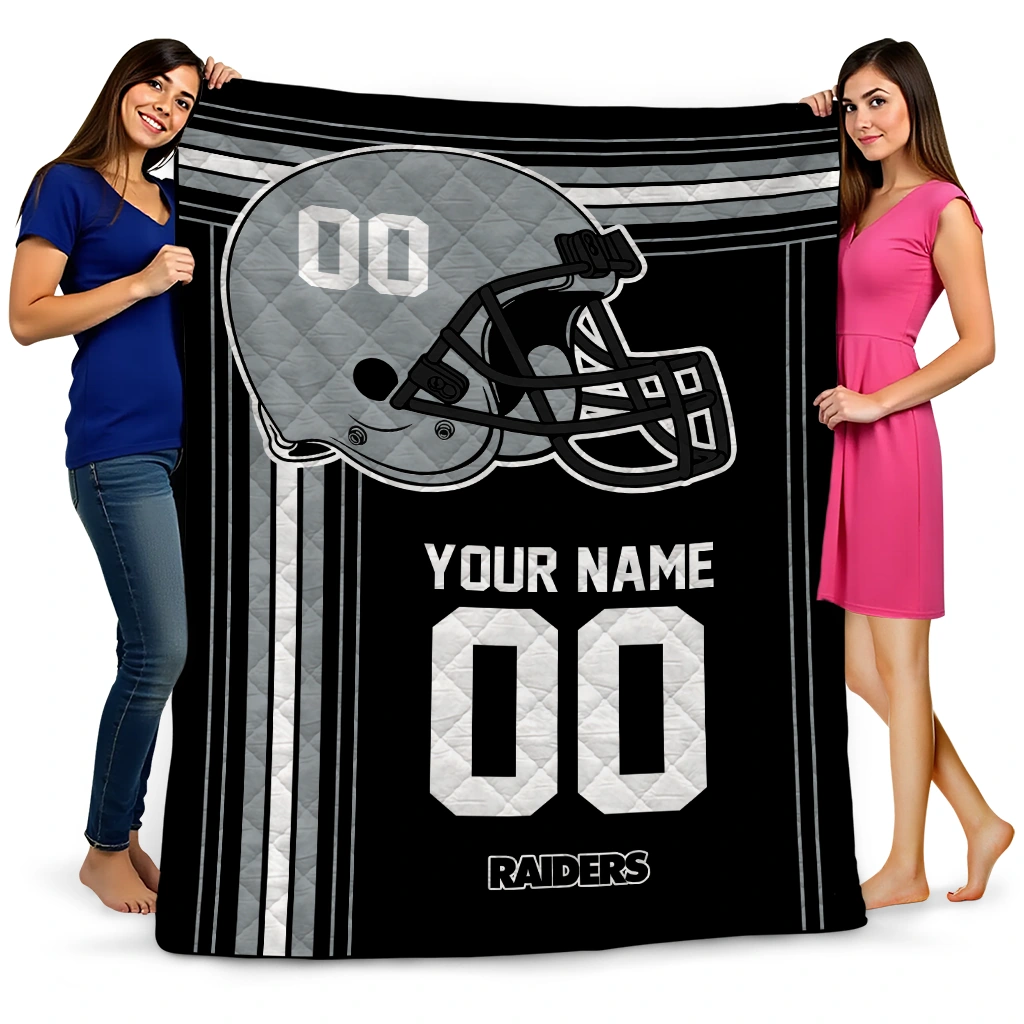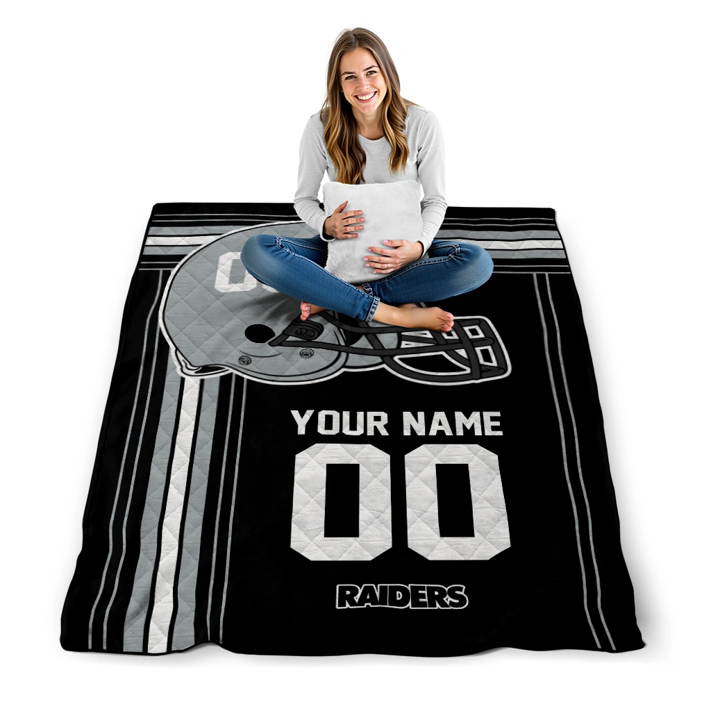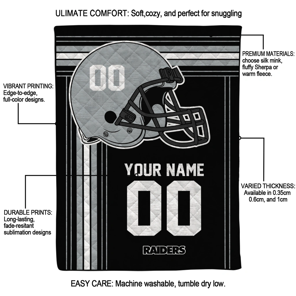 The Personalized Las Vegas Raiders Helmet Theme Black Quilt Blanket is more than a blanket—it’s everyday comfort, thoughtfully made. Crafted from premium quilting fabric with a soft microfiber touch, it offers a smooth hand-feel and lasting coziness. Layered quilting with a cotton-filled core provides adaptable warmth across seasons while maintaining a clean, tailored look on your bed or sofa.