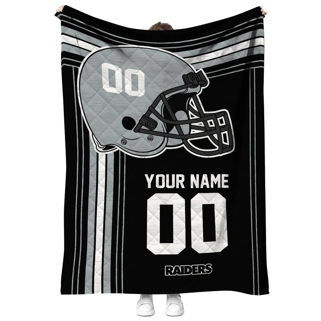 Wrap yourself in warmth and pride with the Personalized Las Vegas Raiders Helmet Theme Black Quilt Blanket from the Las Vegas Raiders Blankets collection at Yes That Blanket. Made from 100% premium quilting-weight polyester blended with a touch of microfiber, this quilt offers a smooth, soft finish you’ll love. Choose between two quilting styles—Stipple or Diagonal—and enjoy the comfort of a cotton-filled layer inside that adds extra coziness for every season. The border is available in classic black or white, giving your design a clean, timeless edge.