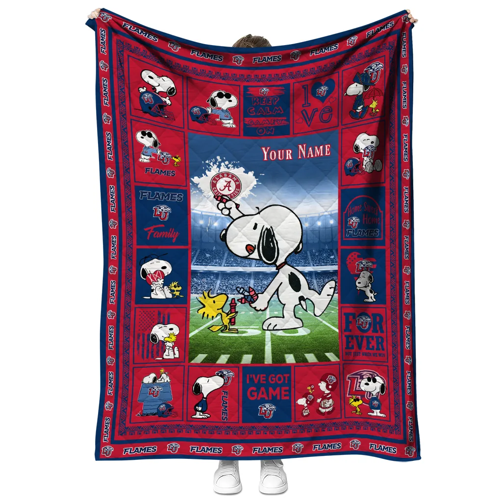 Wrap yourself in warmth and pride with the Personalized Liberty Flames Snoopy Coach Red Quilt Blanket from the Liberty Flames Blankets collection at Yes That Blanket. Made from 100% premium quilting-weight polyester blended with a touch of microfiber, this quilt offers a smooth, soft finish you’ll love. Choose between two quilting styles—Stipple or Diagonal—and enjoy the comfort of a cotton-filled layer inside that adds extra coziness for every season. The border is available in classic black or white, giving your design a clean, timeless edge.